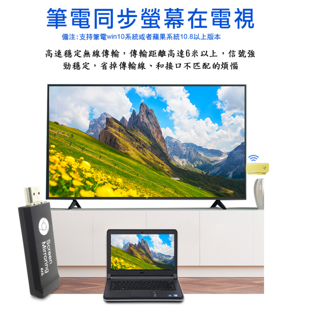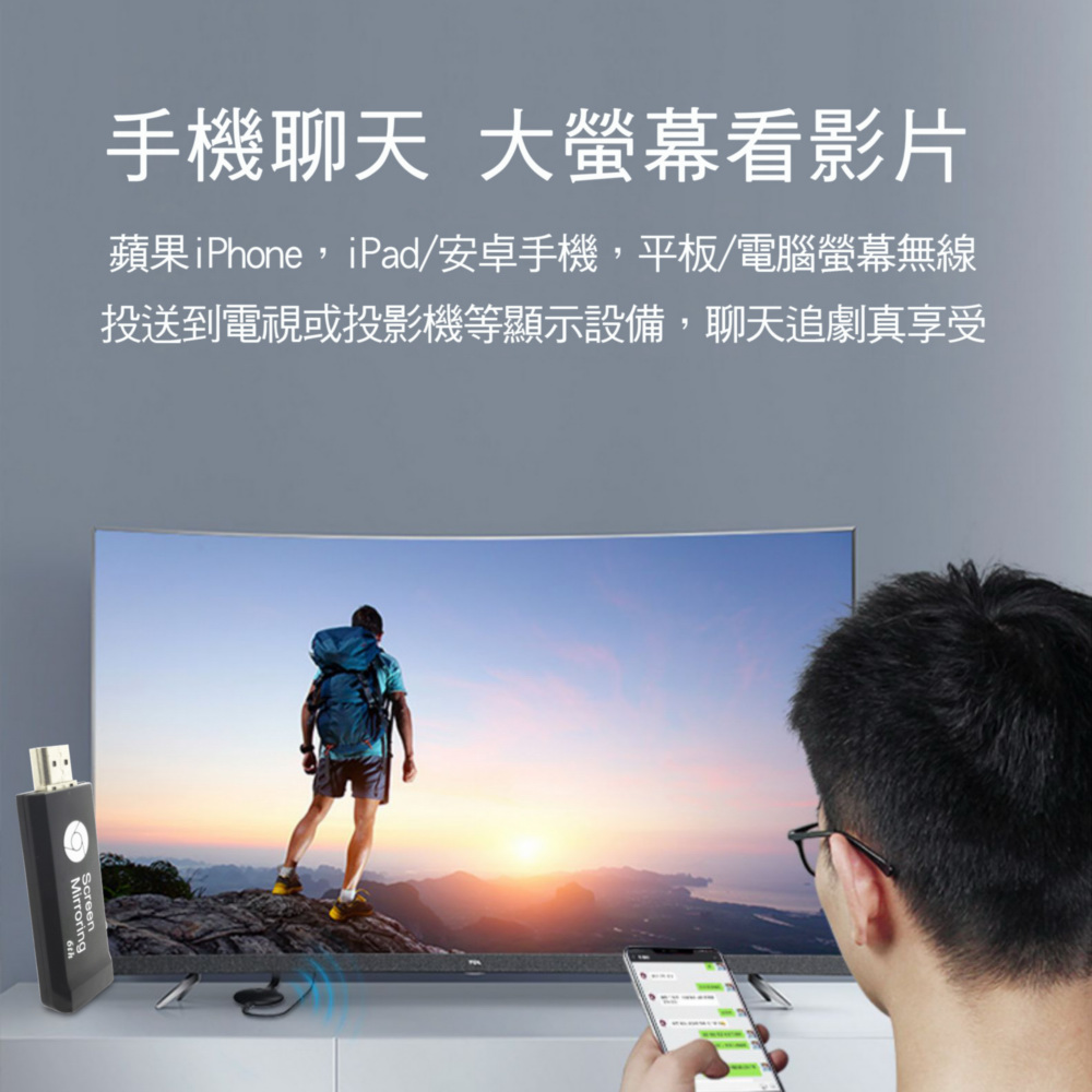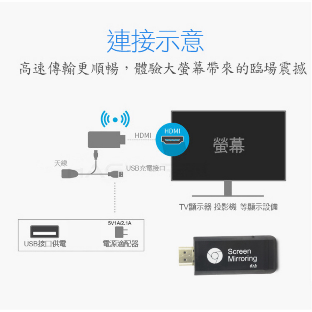 隨時隨地大螢幕娛樂操作簡單影音投影一機多用,教學娛樂導航全搞定免安裝任何軟體無線連結,影音同步分享支援蘋果/安卓/電腦無線投影可電腦直接電視同步顯示高畫質輸出,高速穩定傳輸《商品介紹》隨著智慧型裝置普及,手機、平板、電腦已成為日常不可或缺的工具。但螢幕太小往往影響學習與娛樂體驗。現在,只要一個 無線投影器,就能輕鬆將螢幕畫面同步到電視或投影機,大螢幕享受更清晰、更震撼!隨插即投:操作簡單,免驅動免APP。跨平台支援:支援 iOS / Android / Windows / Mac OS。高畫質輸出:支援 Full HD ,清晰不卡頓。穩定傳輸:低延遲設計,影音同步。輕巧便攜:出差、上課、居家,一機搞定。【應用場景】居家娛樂:追劇、看電影,大螢幕更沉浸。遊戲對戰:手機秒變遊戲主機,刺激加倍。教育教學:課堂同步投影,互動更生動。會議簡報:商務展示更專業,告別繁瑣連線。汽車導航:手機地圖投影到大螢幕,安全又直觀。《注意事項》1.如果要使用在汽車的螢幕投影,請先確認汽車是否有HDMI或AV影音輸入,請確認後再進行購買。2. 本商品是HDMI影音傳輸介面,如果是汽車是AV(黃白紅三色插孔)則需要另外自行準備HDMI轉AV的轉換器才可以使用。《商品配備》無線影音鏡像傳輸器 x1說明書 x14大好禮: HDMI線x1 + HDMI母對母轉接頭x1 + USB充電器 x1 + 指環扣支架x1《商品規格》廠牌: Dawise型號: 六代E6顏色: 黑支援的設備: 蘋果,安卓,微軟裝置支援影音同步傳輸模式: AirPlay/Miracast/DLNA/WIDIUSB供電(DC+5V)HDMI連接電視產地: 中國大陸產品保固: 主機保固3個月,配件/贈品保固1個月,保固範圍不包含人為損壞。《NCC認證字號》 CCAJ15LP0240T0