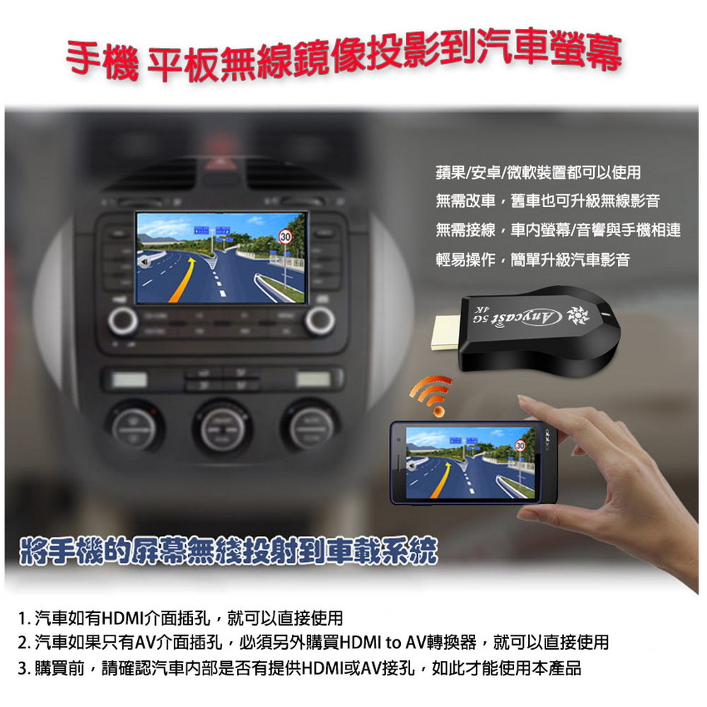 《商品特色》真正高畫質無線影音傳輸支持H.265高畫質無線投影操作簡單 影音投影■支援4K(3840×2160)超高清畫質■免安裝任何軟體■無線連結,影音同步分享■支援蘋果/安卓/電腦無線投影顯示■可電腦直接電視同步顯示■支持Airplay/Miracast/WIDI/DLNA影音同步傳輸模式《商品介紹》隨著智慧型裝置普及,手機、平板、電腦已成為日常不可或缺的工具。但螢幕太小往往影響學習與娛樂體驗。現在,只要一個 無線投影器,就能輕鬆將螢幕畫面同步到電視或投影機,大螢幕享受更清晰、更震撼!隨插即投:操作簡單,免驅動免APP。跨平台支援:支援 iOS / Android / Windows / Mac OS。高畫質輸出:清晰畫質 ,清晰不卡頓。穩定傳輸:低延遲設計,影音同步。輕巧便攜:出差、上課、居家,一機搞定。【應用場景】居家娛樂:追劇、看電影,大螢幕更沉浸。遊戲對戰:手機秒變遊戲主機,刺激加倍。教育教學:課堂同步投影,互動更生動。會議簡報:商務展示更專業,告別繁瑣連線。汽車導航:手機地圖投影到大螢幕,安全又直觀。《注意事項》1.如果要使用在汽車的螢幕投影,請先確認汽車是否有HDMI或AV影音輸入,請確認後再進行購買。2. 本商品是HDMI影音傳輸介面,如果是汽車是AV(黃白紅三色插孔)則需要另外自行準備HDMI轉AV的轉換器才可以使用。《商品配備》無線影音鏡像傳輸器 x1WiFi模組線x1說明書 x14大好禮: USB充電器x1 + HDMI傳輸線x1 + HDMI母對母轉接頭x1 + 手機支架x1《商品規格》廠牌: Dawise型號: 第10代WD65顏色: 黑支援的設備: 蘋果,安卓,微軟裝置支援影音同步傳輸模式: AirPlay/Miracast/DLNA/WIDIUSB供電(DC+5V)HDMI連接電視產地: 中國大陸產品保固: 主機保固3個月,配件/贈品保固1個月,保固範圍不包含人為損壞。《NCC認證字號》CCAJ14LP398ET5