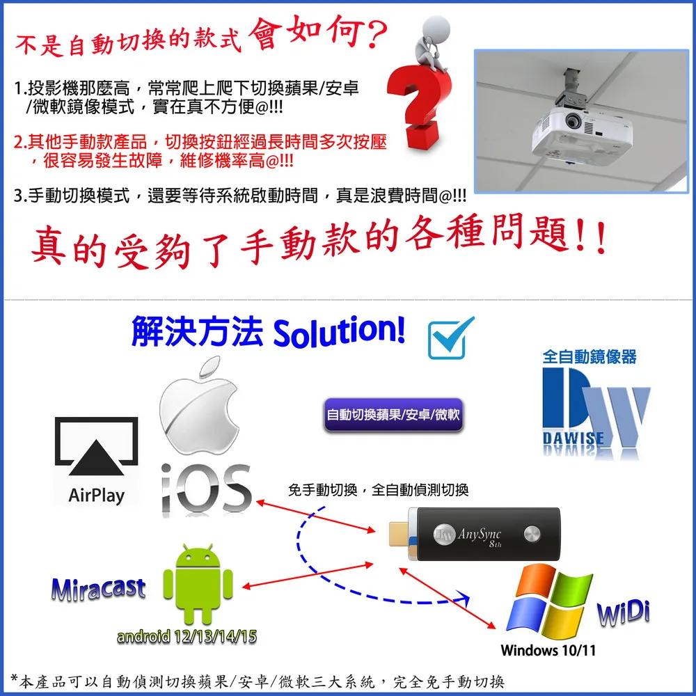 隨時隨地大螢幕娛樂操作簡單影音投影一機多用,教學娛樂導航全搞定免安裝任何軟體無線連結,影音同步分享支援蘋果/安卓/電腦無線投影可電腦直接電視同步顯示高畫質輸出,高速穩定傳輸《商品介紹》隨著智慧型裝置普及,手機、平板、電腦已成為日常不可或缺的工具。但螢幕太小往往影響學習與娛樂體驗。現在,只要一個 無線投影器,就能輕鬆將螢幕畫面同步到電視或投影機,大螢幕享受更清晰、更震撼!隨插即投:操作簡單,免驅動免APP。跨平台支援:支援 iOS / Android / Windows / Mac OS。高畫質輸出:支援 Full HD ,清晰不卡頓。穩定傳輸:低延遲設計,影音同步。輕巧便攜:出差、上課、居家,一機搞定。【應用場景】居家娛樂:追劇、看電影,大螢幕更沉浸。遊戲對戰:手機秒變遊戲主機,刺激加倍。教育教學:課堂同步投影,互動更生動。會議簡報:商務展示更專業,告別繁瑣連線。汽車導航:手機地圖投影到大螢幕,安全又直觀。《注意事項》1.如果要使用在汽車的螢幕投影,請先確認汽車是否有HDMI或AV影音輸入,請確認後再進行購買。2. 本商品是HDMI影音傳輸介面,如果是汽車是AV(黃白紅三色插孔)則需要另外自行準備HDMI轉AV的轉換器才可以使用。《商品配備》無線影音鏡像傳輸器 x1說明書 x14大好禮: USB充電器x1 + USB供電線x1 + HDMI延長線x1 + (手機支架x1 或 指環扣x1 兩款隨機出貨其中一款)《商品規格》廠牌: Dawise型號: 八代WD38顏色: 黑支援的設備: 蘋果,安卓,微軟裝置支援影音同步傳輸模式: AirPlay/Miracast/DLNA/WIDIUSB供電(DC+5V)HDMI連接電視產地: 中國產品保固: 主機保固3個月,配件/贈品保固1個月,保固範圍不包含人為損壞。《注意事項:》產品顏色可能會因為相機拍照色偏因素而有差異,請以實際出貨為準。《NCC認證字號》 CCAJ15LP0826T4