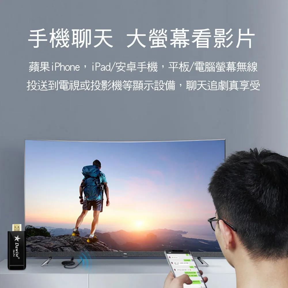 隨時隨地大螢幕娛樂操作簡單影音投影一機多用,教學娛樂導航全搞定免安裝任何軟體無線連結,影音同步分享支援蘋果/安卓/電腦無線投影可電腦直接電視同步顯示高畫質輸出,高速穩定傳輸《商品介紹》隨著智慧型裝置普及,手機、平板、電腦已成為日常不可或缺的工具。但螢幕太小往往影響學習與娛樂體驗。現在,只要一個 無線投影器,就能輕鬆將螢幕畫面同步到電視或投影機,大螢幕享受更清晰、更震撼!隨插即投:操作簡單,免驅動免APP。跨平台支援:支援 iOS / Android / Windows / Mac OS。高畫質輸出:支援 Full HD ,清晰不卡頓。穩定傳輸:低延遲設計,影音同步。輕巧便攜:出差、上課、居家,一機搞定。【應用場景】居家娛樂:追劇、看電影,大螢幕更沉浸。遊戲對戰:手機秒變遊戲主機,刺激加倍。教育教學:課堂同步投影,互動更生動。會議簡報:商務展示更專業,告別繁瑣連線。汽車導航:手機地圖投影到大螢幕,安全又直觀。《注意事項》1.如果要使用在汽車的螢幕投影,請先確認汽車是否有HDMI或AV影音輸入,請確認後再進行購買。2. 本商品是HDMI影音傳輸介面,如果是汽車是AV(黃白紅三色插孔)則需要另外自行準備HDMI轉AV的轉換器才可以使用。《商品配備》無線影音鏡像傳輸器 x1說明書 x14大好禮: USB充電器x1 + HDMI影音線x1 + HDMI母對母轉接頭x1 + 手機支架x1《商品規格》廠牌: Dawise型號: 七代E6顏色: 黑支援的設備: 蘋果,安卓,微軟裝置支援影音同步傳輸模式: AirPlay/Miracast/DLNA/WIDIUSB供電(DC+5V)HDMI連接電視產地: 中國大陸產品保固: 主機保固3個月,配件/贈品保固1個月,保固範圍不包含人為損壞。《NCC認證字號》CCAJ15LP0240T0