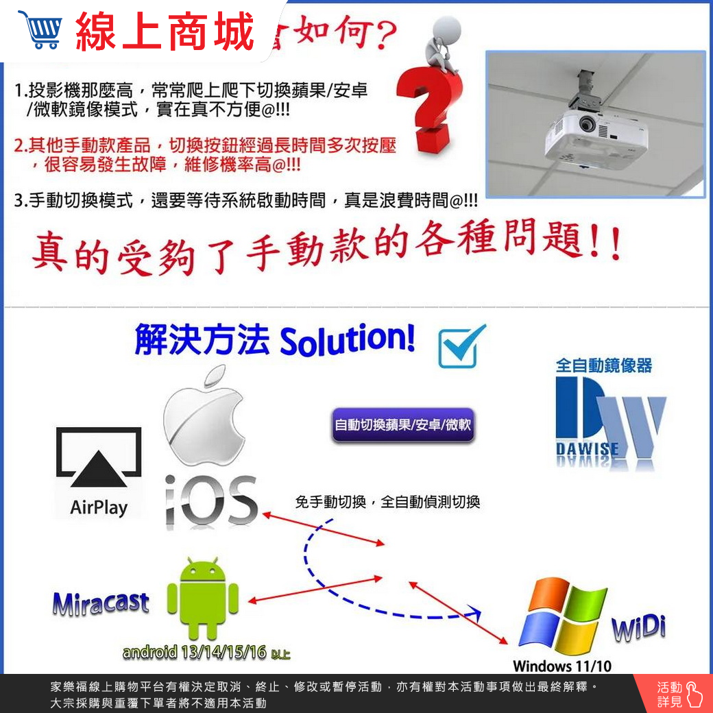 隨時隨地大螢幕娛樂操作簡單影音投影一機多用,教學娛樂導航全搞定免安裝任何軟體無線連結,影音同步分享支援蘋果/安卓/電腦無線投影可電腦直接電視同步顯示高畫質輸出,高速穩定傳輸《商品介紹》隨著智慧型裝置普及,手機、平板、電腦已成為日常不可或缺的工具。但螢幕太小往往影響學習與娛樂體驗。現在,只要一個 無線投影器,就能輕鬆將螢幕畫面同步到電視或投影機,大螢幕享受更清晰、更震撼!隨插即投:操作簡單,免驅動免APP。跨平台支援:支援 iOS / Android / Windows / Mac OS。高畫質輸出:支援 Full HD ,清晰不卡頓。穩定傳輸:低延遲設計,影音同步。輕巧便攜:出差、上課、居家,一機搞定。【應用場景】居家娛樂:追劇、看電影,大螢幕更沉浸。遊戲對戰:手機秒變遊戲主機,刺激加倍。教育教學:課堂同步投影,互動更生動。會議簡報:商務展示更專業,告別繁瑣連線。汽車導航:手機地圖投影到大螢幕,安全又直觀。《注意事項》1.如果要使用在汽車的螢幕投影,請先確認汽車是否有HDMI或AV影音輸入,請確認後再進行購買。2. 本商品是HDMI影音傳輸介面,如果是汽車是AV(黃白紅三色插孔)則需要另外自行準備HDMI轉AV的轉換器才可以使用。《商品配備》無線影音鏡像傳輸器 x1WiFi模組線x1說明書 x14大好禮: USB充電器x1 + HDMI傳輸線x1 + HDMI母對母轉接頭x1 + 手機支架x1《商品規格》廠牌: Dawise型號: 七代E6顏色: 黑支援的設備: 蘋果,安卓,微軟裝置支援影音同步傳輸模式: AirPlay/Miracast/DLNA/WIDIUSB供電(DC+5V)HDMI連接電視產地: 中國大陸產品保固: 主機保固3個月,配件/贈品保固1個月,保固範圍不包含人為損壞。《NCC認證字號》CCAJ15LP0240T0