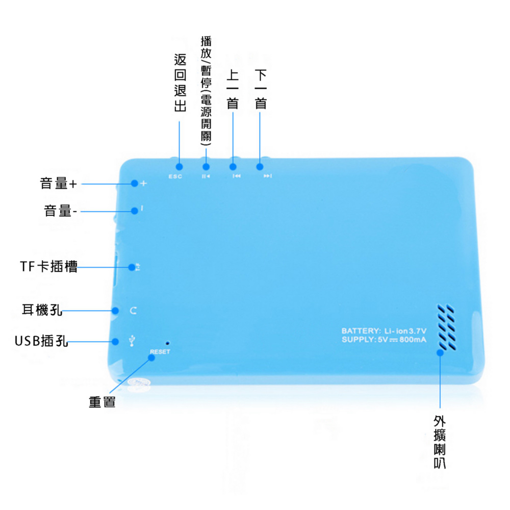 《商品介紹》影音真享受多種影音規格免轉檔內建立體音效雙喇叭高畫質螢幕, 看電影圖片相當清晰內建立體喇叭輸出支援多種高清解碼視訊具電子書閱讀功能內建多種遊戲, 滿足動感娛樂支援MP3、RM、RMVB、AVI、VCD、DVD、MOV、MKV等數十種影音格式播放高解析清楚的影片解碼, 讓您擁有掌上電影的視覺體驗高畫質顯示螢幕內建多款遊戲娛樂可讀TXT電子書支援錄音功能圖片格式: JPG、BMP格式可外插TF卡擴充容量語言: 繁體中文 / 簡體中文 / 英文....等音樂格式: MP3影片格式: MP4 、MKV、AVI 、RM、RMVB、3GP、FLV等格式錄音取樣頻率: 32K-64K內建鋰電池與電腦連結,隨插即用,不需驅動程式