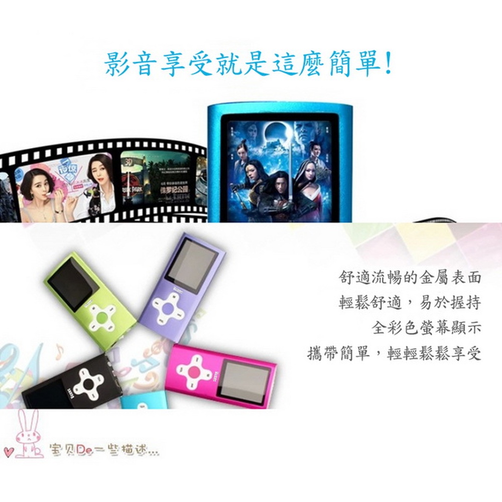 《商品介紹》音樂聽不累可看影片及照片1.8吋26萬色TFT螢幕高音質MP3音樂播放彩色照片及影片播放金屬外殼,輕薄好攜帶內建記憶體支援多種音樂格式真正支援電影播放最高等級真正1.8吋大螢幕TFT屏26萬5000色彩色螢幕多種音效模式,讓您愛怎麼聽就怎麼聽可選擇資料夾播放設定電子相簿JPEG圖片瀏覽功能電子書TXT文字閱讀功能睡眠定時關機設置背光時間設置、省電模式設置、螢幕亮度設置最新全彩圖形化界面操作,方便易懂透過目錄瀏覽可快速選到要聽的歌曲可設置在多長時間內無按鍵操作屏幕變黑(0~30秒)睡眠模式讓你可設定0~120分鐘省電功能讓你可設定 0~60 秒螢幕保護省電使用電源是內置高效能鋰電池