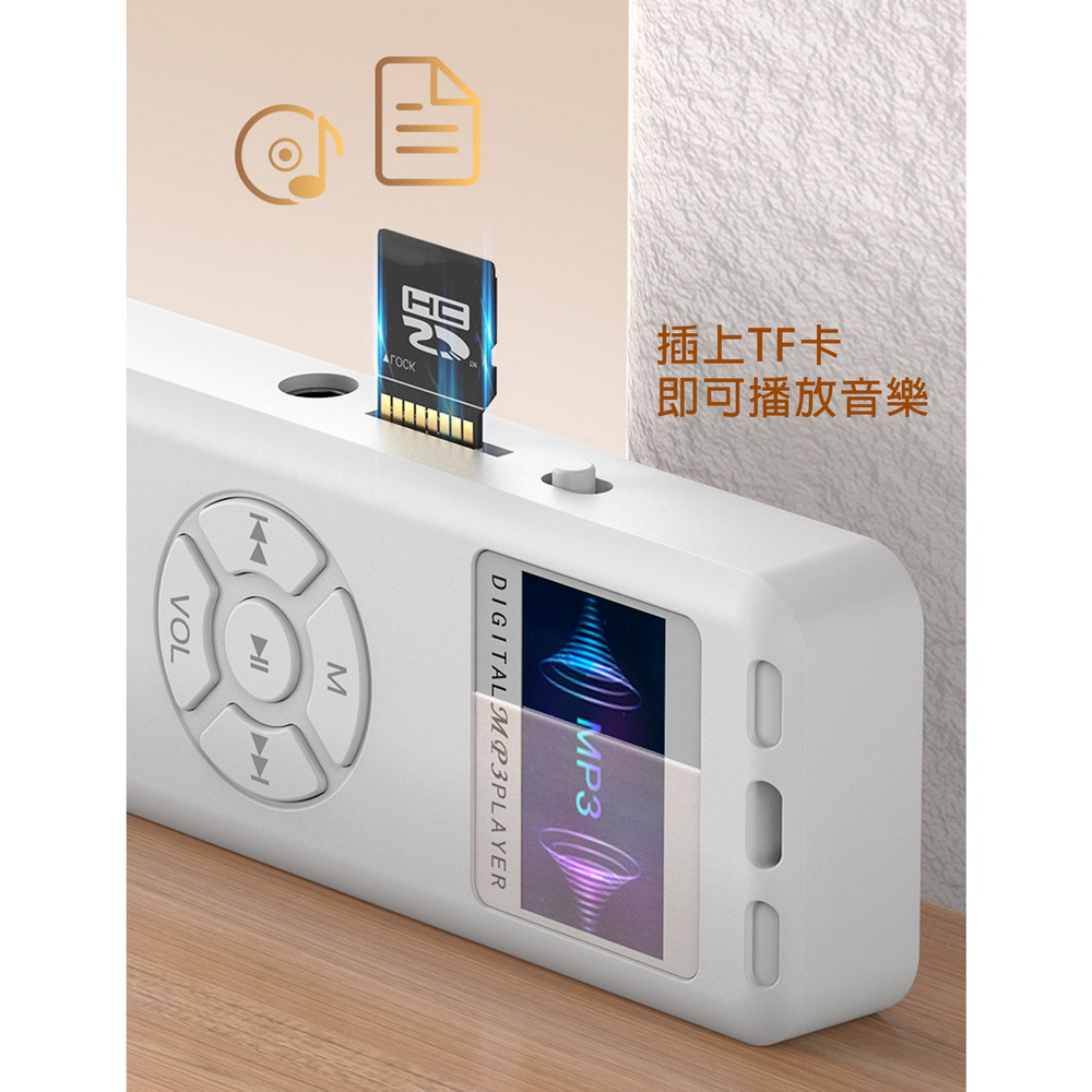 《商品介紹》隨心聽行走的音符沉浸樂境悅耳純音• 簡約好音質,隨時悅享聽• 高音質MP3音樂播放• 操作簡單,使用便利• 精美外殼,輕薄好攜帶支援TF卡插卡功能支援高品質音樂播放支持細緻螢幕顯示多種音效模式,讓您愛怎麼聽就怎麼聽電子書TXT文字閱讀功能背光時間設置螢幕界面操作,方便易懂使用電源是內置高效能鋰電池《注意事項》本商品無內建記憶體,需外接插卡才可以使用音樂需MP3格式