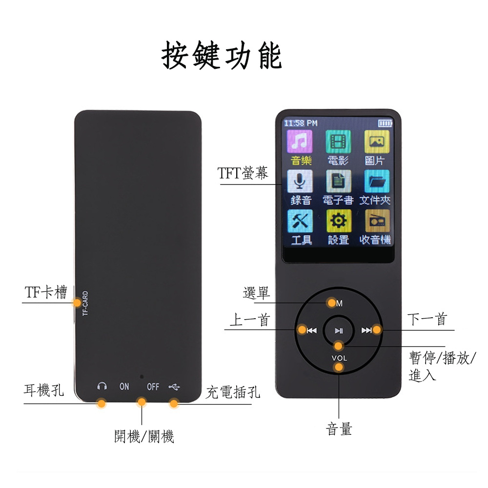 《商品介紹》音樂聽不累可看影片及照片1.8吋26萬色TFT螢幕高音質MP3音樂播放彩色照片及影片播放精美外殼,輕薄好攜帶支援TF卡插卡功能支援高品質音樂播放真正支援電影播放最高等級真正1.8吋大螢幕TFT屏26萬5000色彩色螢幕多種音效模式,讓您愛怎麼聽就怎麼聽電子相簿JPEG圖片瀏覽功能電子書TXT文字閱讀功能睡眠定時關機設置背光時間設置、省電模式設置、螢幕亮度設置最新全彩圖形化界面操作,方便易懂可設置在多長時間內無按鍵操作屏幕變黑(0~30秒)睡眠模式讓你可設定0~120分鐘省電功能讓你可設定 0~60 秒螢幕保護省電使用電源是內置高效能鋰電池《注意事項》本商品無內建記憶體,需外接插卡才可以使用音樂需MP3格式,影片須轉檔為AMV檔案格式