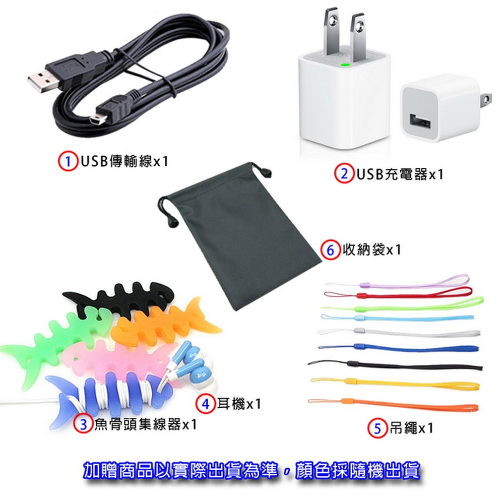 《商品配備》MP4主機 x164GB記憶卡x16大好禮: 充電器x1, USB傳輸線x1, 耳機 x1, 收納袋x1, 魚骨頭集線器x1, 吊繩x1