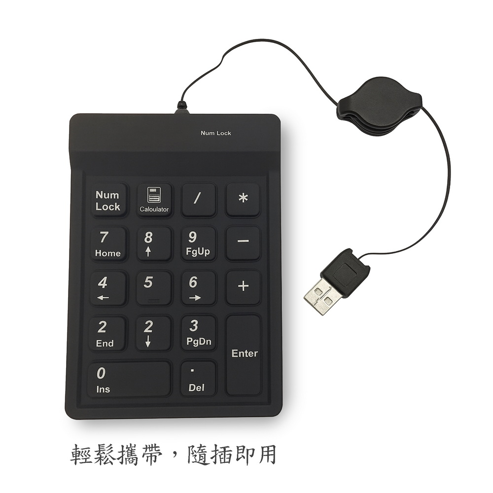 《商品介紹》數字輸入,快人一步小巧便攜,隨插即用靜音設計,專注不打擾辦公效率翻倍,輕鬆搞定資料伸縮線設計,告別纏繞即插即用,無需安裝驅動伸縮 USB 線,收納方便不打結輕薄便攜,外出辦公好幫手隨插即用 Plug & Play,不需要安裝驅動程式輕薄便攜,外出辦公好幫手。USB伸縮線設計,不怕纏繞。耐用設計,長時間使用不卡鍵,快速數字輸入,效率提升 200%。輕盈設計,隨身攜帶無負擔。筆電輸入好幫手,資料處理更高效。數字輸入更快,省時省力不只是鍵盤,更是你的效率神器。