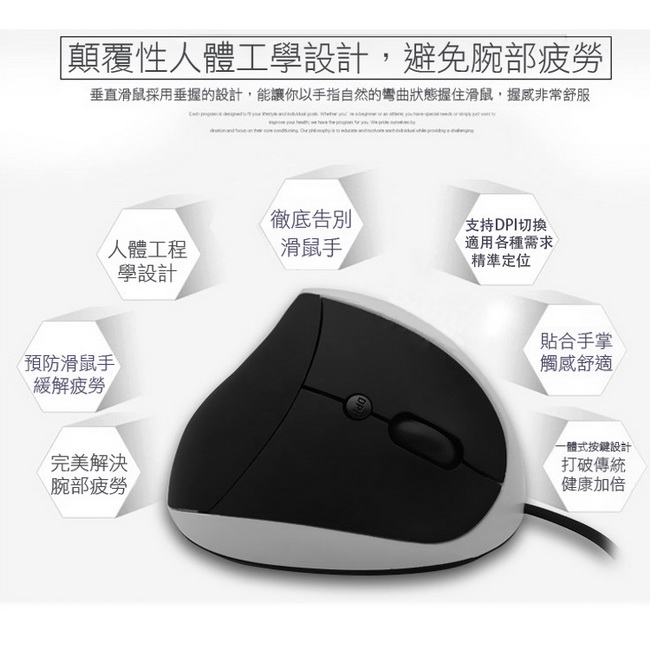 《商品介紹》握感就是這麼舒適長時間使用滑鼠一點都不累真正人體工學垂直設計光學定位精準靈敏,滾輪滾動非常流暢不需安裝任何軟體驅動,隨插即用保護手腕,避免長期使用滑鼠造成職業傷害靈敏感應,滑動自如