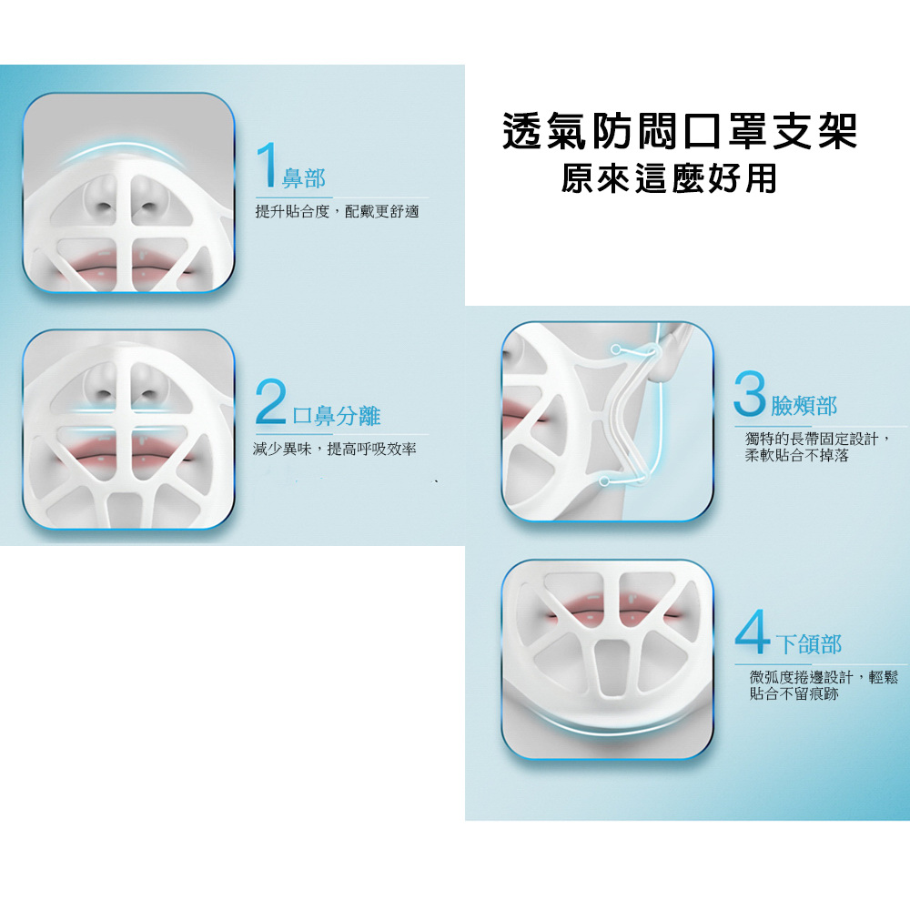《商品介紹》搭配口罩的最佳神器解決長時間配戴口罩的困擾立體支撐 空氣流通更舒適人體工學設計 3D立體支撐適合不同臉型使用減少直接接觸口罩 增加安全使用便利 簡易扣掛舒適 透氣 清爽可水洗重複使用《注意事項》1. 本商品不含口罩,商品主體是口罩支架2. 本商品的尺寸只適合兒童的臉型及尺寸使用,不適合成人的口罩尺寸使用。3. 本商品是屬於衛生用品類,商品拆封後,不再享有退貨服務。