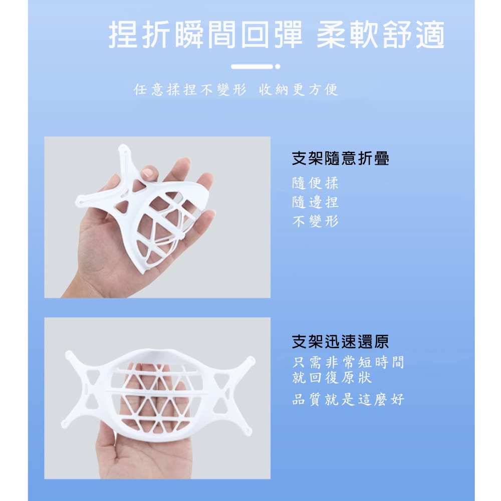 《商品介紹》搭配口罩的最佳神器解決長時間配戴口罩的困擾立體支撐 空氣流通更舒適人體工學設計 3D立體支撐• 適合不同臉型使用• 減少直接接觸口罩 增加安全• 使用便利 簡易扣掛• 舒適 透氣 清爽• 可水洗重複使用《注意事項》1. 本商品不含口罩,商品主體是口罩支架2. 本商品是屬於衛生用品類,商品拆封後,不再享有退貨服務。