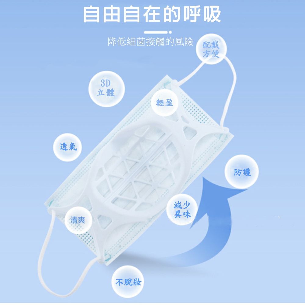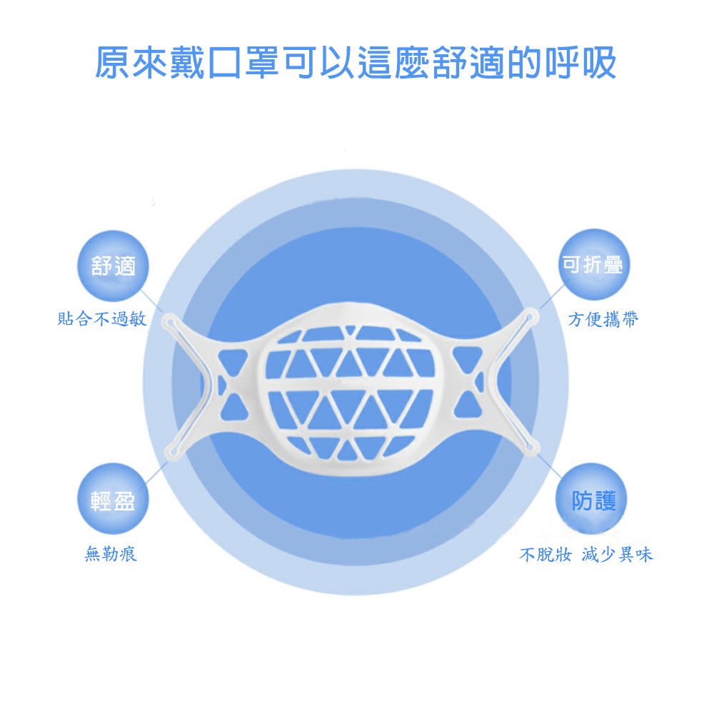 《商品介紹》搭配口罩的最佳神器解決長時間配戴口罩的困擾立體支撐 空氣流通更舒適人體工學設計 3D立體支撐• 適合不同臉型使用• 減少直接接觸口罩 增加安全• 使用便利 簡易扣掛• 舒適 透氣 清爽• 可水洗重複使用《注意事項》1. 本商品不含口罩,商品主體是口罩支架2. 本商品是屬於衛生用品類,商品拆封後,不再享有退貨服務。