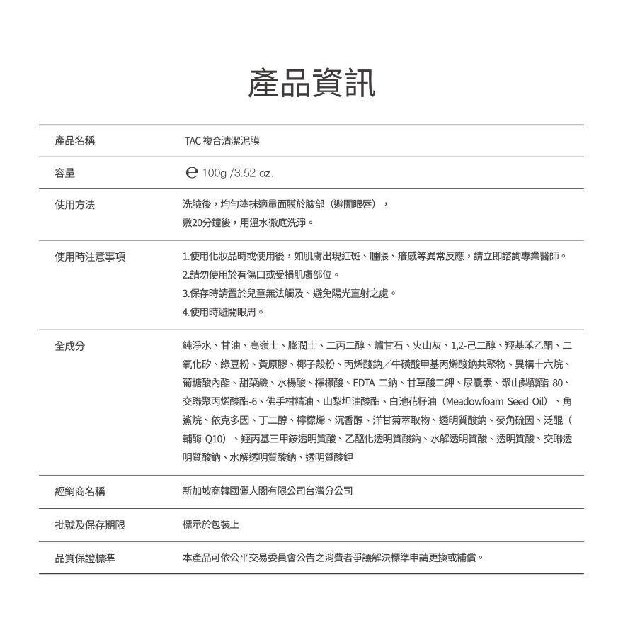 免運 [韓國儷人閣] DERMABELL德瑪貝爾 TAC複合清潔泥膜