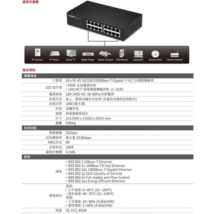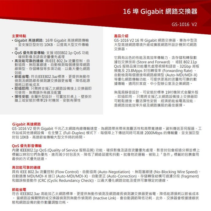 Gigabit 高速網路: 16埠 Gigabit 高速網路傳輸,並支援巨型封包 10KB,以提高大型文件傳輸率。• QoS 優先影音傳輸: 支援 IEEE802.1p QoS 功能,確保影像及語音流量優先處理。• 高效能可靠的連線: 具IEEE 802.3x 流量控制、自動協商、無阻塞線速、自動檢測每個連接埠網路線類型、存儲轉發等多項功能,以最大優化網路效能。• 節能省電: 符合IEEE802.3az標準,更提供無動作偵測及網路線長偵測讓交換器更省電,降低能源損耗以節省成本。• 即插即用: 只需將支援乙太網路設備接上交換器即可使用,無需額外佈線及配置。• 彈性安裝: 金屬外型設計,可置放於桌上、壁掛於牆上或安裝於標準19 吋機架,安裝有彈性。