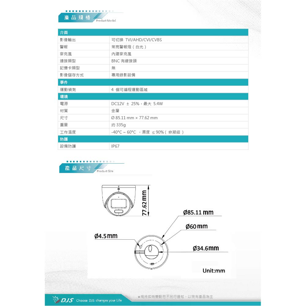 昌運監視器 DJS-2T73CLS 全彩200萬智慧雙光聲音半球型攝影機 智慧雙光功能 內建麥克風