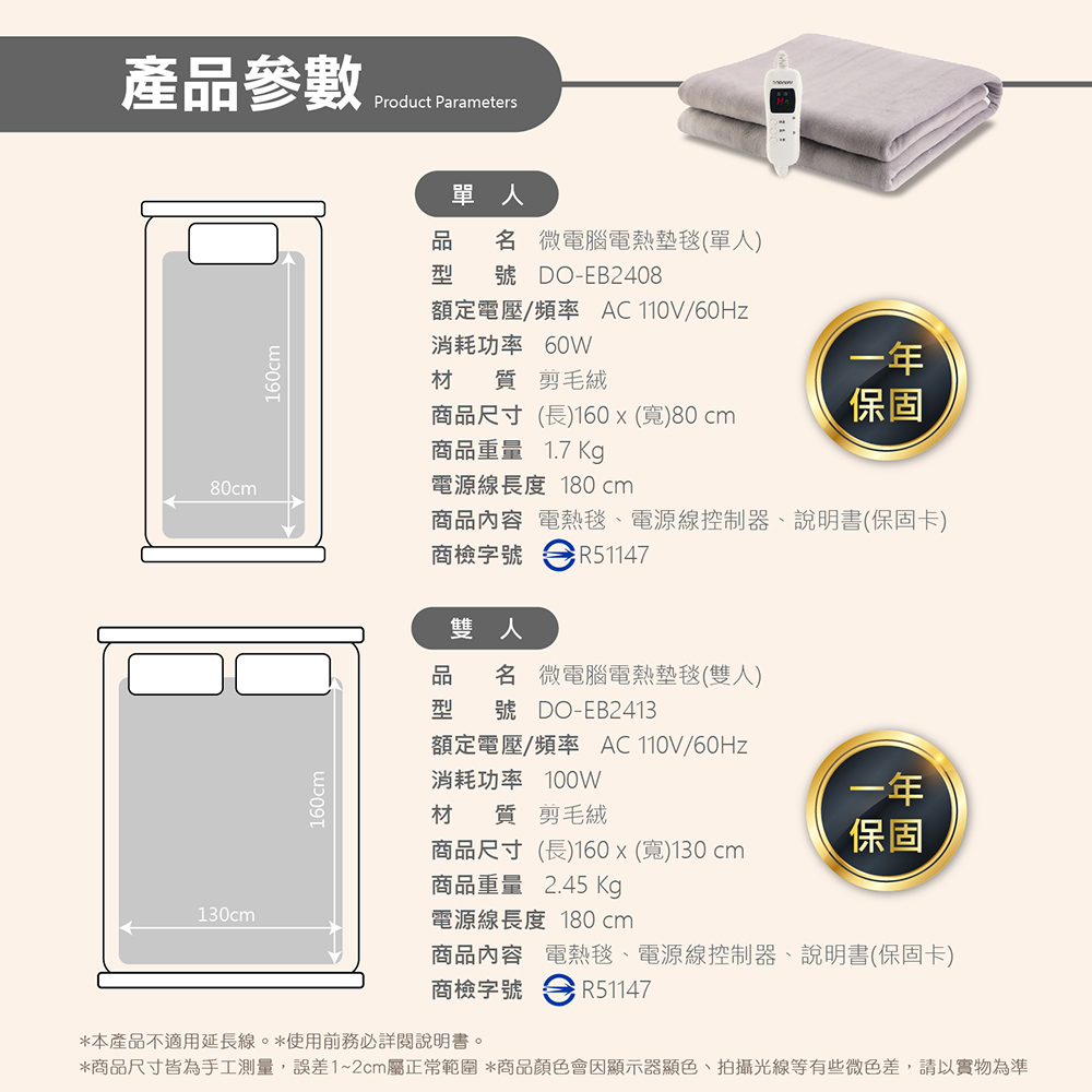 [嘟嘟屋DODOWU]微電腦智能電熱毯 / 單人 / DO-EB2408
