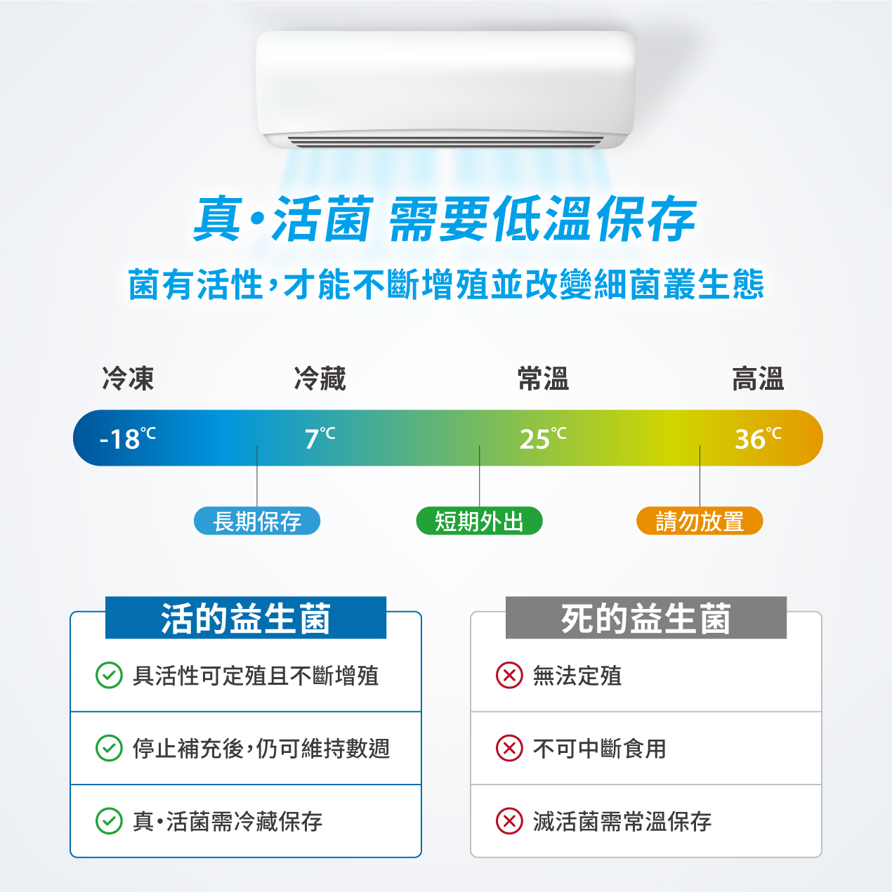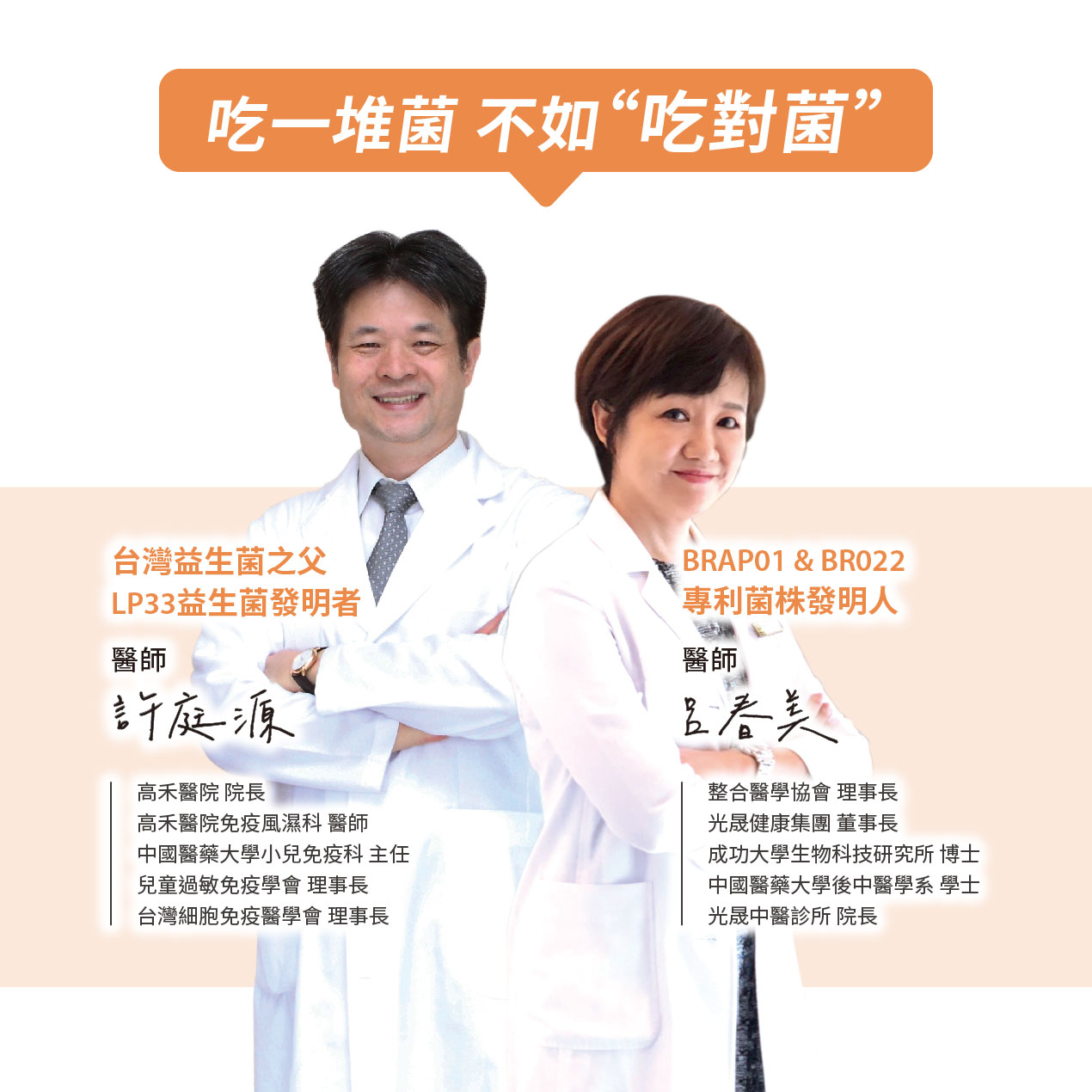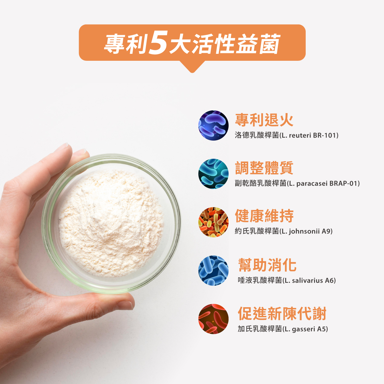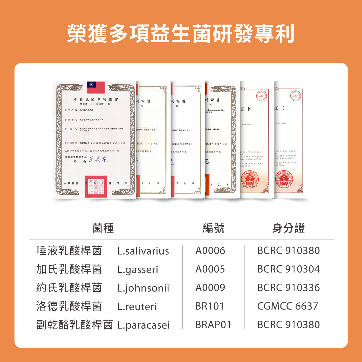 一、5支國家專利活性菌株,營養補給調整體質洛德乳酸桿菌L.reuteri(BR101) ⇒ 調節生理機能副乾酪乳酸桿菌L.paracasei(BRAP01) ⇒ 調整體質約氏乳酸桿菌L.johnsonii(A0009) ⇒ 健康維持唾液乳酸桿菌L.salivarius(A0006) ⇒ 幫助消化加氏乳酸桿菌L.gasseri(A0005) ⇒ 促進新陳代謝二、2支專利益生質雙重補給,幫助好菌生長滋補強身Fibersol ⇒ 水溶膳食纖維,幫助消化使順便順暢半乳寡糖 ⇒ 幫助益生菌成長、定殖、繁衍三、冷藏運送維持菌秼活性從工廠製造到出貨配送,全程低溫保存,新鮮運送益生菌,維持益生菌效果。四、生產工廠通過國際多項認證保障品質自有工廠研發、生產及銷售,台灣製造品質保證製造工廠符合ISO22000、HACC國家與國際品質規範五、專業團隊親自研發生產由發現「LP33」菌株的臺灣益生菌之父—許庭源醫師與免疫學專家—呂春美博士率領專業團隊研發,擁有許多專利菌株技術,帶給最適合國人體質的機能性益生菌