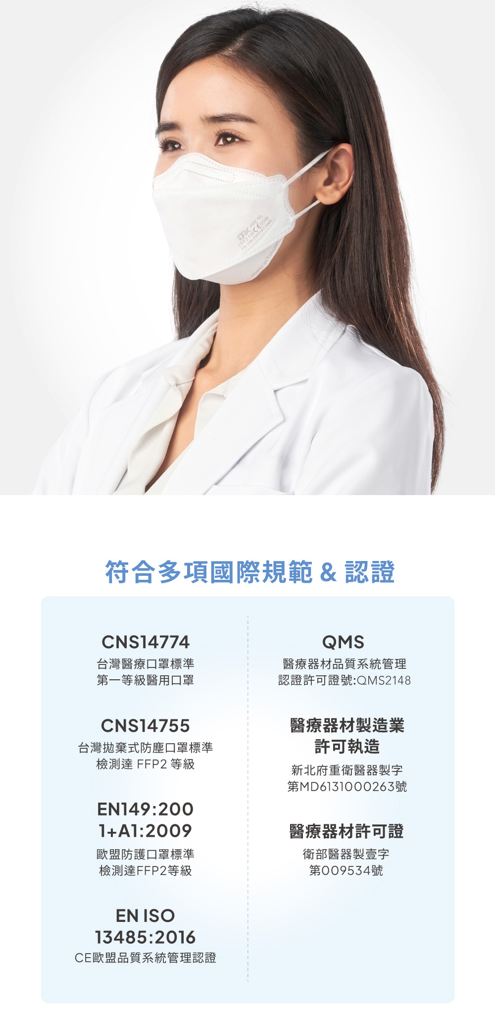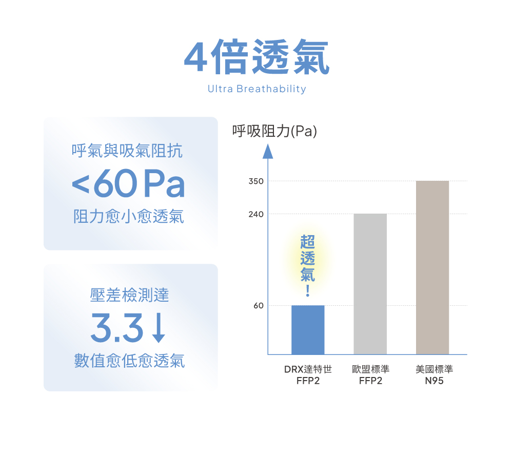 「消費者使用前應詳閱醫療器材說明書」●醫療器材品名:“達特世”FFP2 醫用防護口罩 ●醫療器材許可證字號:衛部醫器製壹字第009534號●許可證所有人:達特世生技有限公司●許可證所有人地址:新北市三重區溪尾街14號5樓●製造業者名稱:達特世生技有限公司●製造業者地址:新北市三重區溪尾街14號5樓之1及5樓之2●醫療器材商名稱:達特世生技有限公司●醫療器材商地址:新北市三重區溪尾街14號5樓●醫療器材商許可證字號:新北府重衛醫器販字第 MD6231017084 號●醫療器材商諮詢專線:02-22868689品牌:DRX 達特世規格:20入/1組貨源:自產自銷產地:台灣材質:不織布保存期限:4年「此商品屬個人衛生用品,不適用七天鑑賞期法規,拆封無猶豫期,如欲退貨請勿拆封。」【小提醒】※FFP2 - S款無附贈調節扣※服務時間:周一至週五 09:00 ~ 18:00 (例假日、國定假日除外)假日不出貨,顏色及數量已當下實際庫存量為主,庫存量不足將另行通知!※口罩屬個人衛生用品故經拆封後符合消保法第十九條所訂定之合理例外情事,無七日猶豫期,如欲退貨請勿拆封※※每批布的顏色,略有色差,依實際出貨商品為主※注意: 由於超商有寄貨限制,一筆訂單最多18盒 (如果超過18盒, 請分兩筆訂單下單)注意: 由於超商有寄貨限制,一筆訂單最多18盒 (如果超過18盒, 請分兩筆訂單下單)注意: 由於超商有寄貨限制,一筆訂單最多18盒 (如果超過18盒, 請分兩筆訂單下單)【商品資訊】●醫療器材品名:“達特世”FFP2 醫用防護口罩 ●核准字號:衛部醫器製壹字第009534號●規格:20片/盒(5片/袋、4袋/盒)●尺寸:【成人】20.5cmX8.1cm (±0.5cm)【兒童】17.2cmX6.8cm (±0.5cm) 【建議3-12歲】●顏色:冰晶白●主要成分或材料:防潑水性不織布、FFP2等級熔噴不織布、親膚性不織布●保存期限:4年●製造日期: 2025.01.21●商品原產地:台灣●貨源:公司貨●三層不織布結構 (防護力與透氣度優於N95)●過濾顆粒:油性粒子+非油性粒子●過濾效率:99%●口罩密合度>95%●符合 CE EN 149:2001+ A1:2009 FFP2 標準,比N95更高防護力●符合 CNS14755(Z2125)拋棄式防塵口罩 D2 等級性能規格:※次微米粒子過濾效率(Submicro particulate filtration efficiency) 95%以上。※壓差(Differential pressure):吸氣阻抗 350Pa(35mmH2O)以下、呼氣阻抗250Pa(25mmH2O)以下。●符合國家標準 CNS14774 / CNS 14755●符合歐盟 EN 149:2001+A1:2009標準●FFP2 證書號0598/PPE/22/2024●型號:PPE-95【醫療器材許可證】核定中文品名:“達特世” FFP2醫用防護口罩 (未滅菌)核准字號:衛部醫器製壹字第009534號製造業者名稱:達特世生技有限公司製造業者地址:新北市三重區溪尾街14號5樓之1及5樓之2【販賣業醫療器材商許可執照】許可執照字號: 新北府重衛醫器販字第 MD6231017084 號醫療器材商名稱:達特世生技有限公司地址:新北市三重區溪尾街14號5樓諮詢專線電話:02-22868689