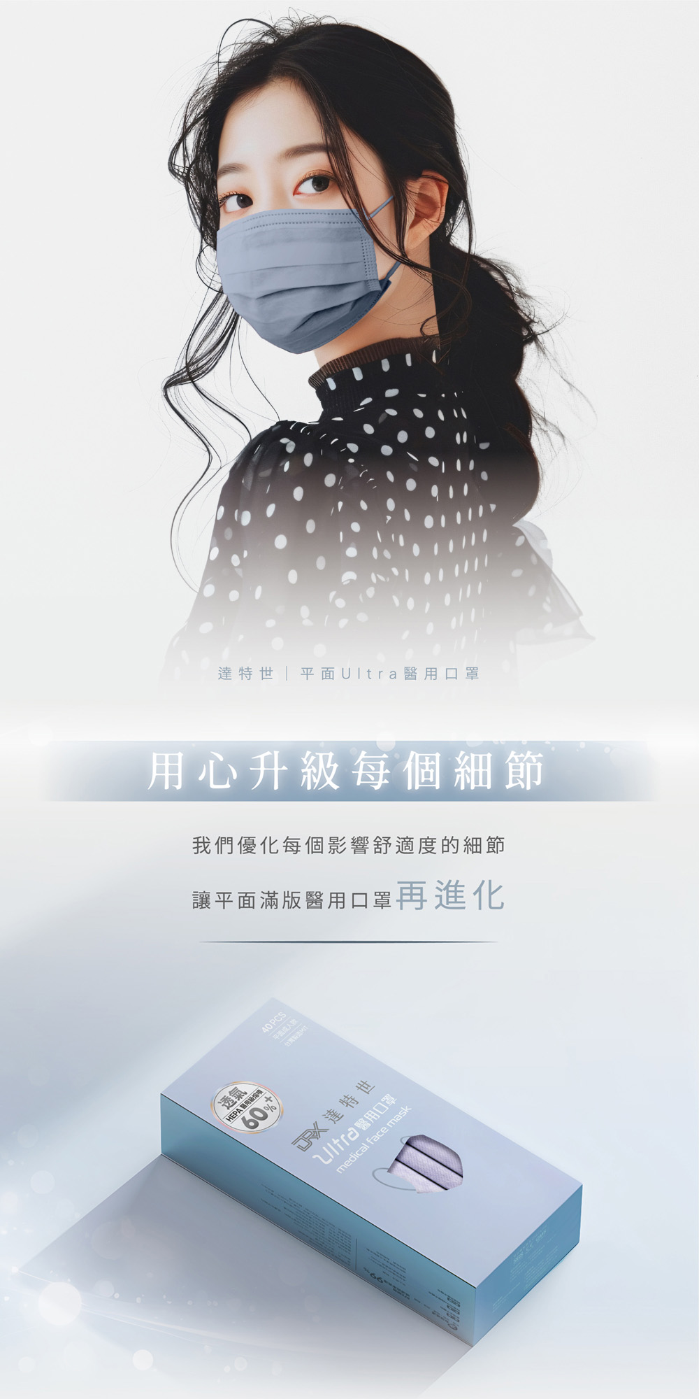 「消費者使用前應詳閱醫療器材說明書」●醫療器材品名: "達特世" 醫用口罩 (未滅菌)●醫療器材許可證字號:衛部醫器製壹字第008685號●許可證所有人:達特世生技有限公司●許可證所有人地址:新北市三重區溪尾街14號5樓●製造業者名稱:達特世生技有限公司●製造業者地址:新北市三重區溪尾街14號5樓之1及5樓之2●醫療器材商名稱:達特世生技有限公司●醫療器材商地址:新北市三重區溪尾街14號5樓●醫療器材商許可證字號:新北府重衛醫器販字第 MD6231017084 號●醫療器材商諮詢專線:02-22868689品牌:DRX 達特世規格:40入/1組貨源:自產自銷產地:台灣材質:不織布保存期限:5年「此商品屬個人衛生用品,不適用七天鑑賞期法規,拆封無猶豫期,如欲退貨請勿拆封。」【小提醒】※假日不出貨,顏色及數量已當下實際庫存量為主,庫存量不足將另行通知※※口罩屬個人衛生用品故經拆封後符合消保法第十九條所訂定之合理例外情事,無七日猶豫期,如欲退貨請勿拆封※※每批布的顏色,略有色差,依實際出貨商品為主※注意: 由於超商有寄貨限制,一筆訂單最多18盒 (如果超過18盒, 請分兩筆訂單下單)注意: 由於超商有寄貨限制,一筆訂單最多18盒 (如果超過18盒, 請分兩筆訂單下單)注意: 由於超商有寄貨限制,一筆訂單最多18盒 (如果超過18盒, 請分兩筆訂單下單)【商品特色】✨無勒感耳帶/透氣不悶熱✨通過CNS14774測試標準✨台灣生產製造,品質保證【商品資訊】●醫療器材品名: "達特世" 醫用口罩 (未滅菌)●醫療器材許可證字號:衛部醫器製壹字第008685號●規格:40片/盒(單色) (平面ULTRA)20片/盒(四色綜合)30片/盒(單色) (舊款滿版)●尺寸:17.5cm*9.5cm(±0.5cm)●主要成分或材料:防潑水性不織布、熔噴不織布、親膚性不織布●保存期限:5年●製造日期: 2025.01.20●商品原產地:台灣●貨源:公司貨【醫療器材許可證】核定中文品名: "達特世" 醫用口罩 (未滅菌)核准字號:衛部醫器製壹字第008685號製造業者名稱:達特世生技有限公司製造業者地址:新北市三重區溪尾街14號5樓之1【販賣業醫療器材商許可執照】許可執照字號: 新北府重衛醫器販字第 MD6231017084 號醫療器材商名稱:達特世生技有限公司地址:新北市三重區溪尾街14號5樓諮詢專線電話:02-22868689