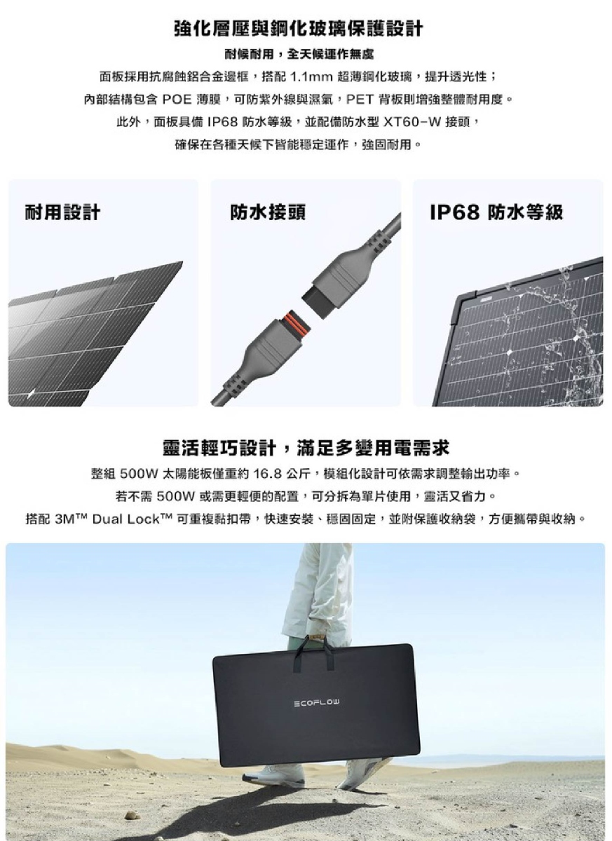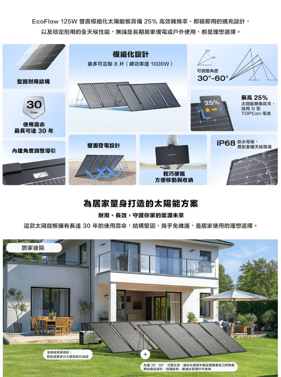 • 模組化設計:最多可並聯 8 片太陽能板(總功率達 1000W)• 可調式角度設計:角度可在 30–60° 之間調整,以獲得最佳日照效率• 最高 25% 轉換效率• 標準測試條件(STC)功率 125W,最佳北方光照(BNPI)達 138W• 採用 TOPCon 太陽能電池,即使在弱光或高溫環境下也能穩定發電• IP68 防水等級,堅固耐用,應對各種天候• 多元應用場景:適用於居家、後院或露營車(RV)使用• 輕量設計:4 片太陽能板總重僅 16.2 公斤(35.2 磅)• 產品壽命最高達 30 年
