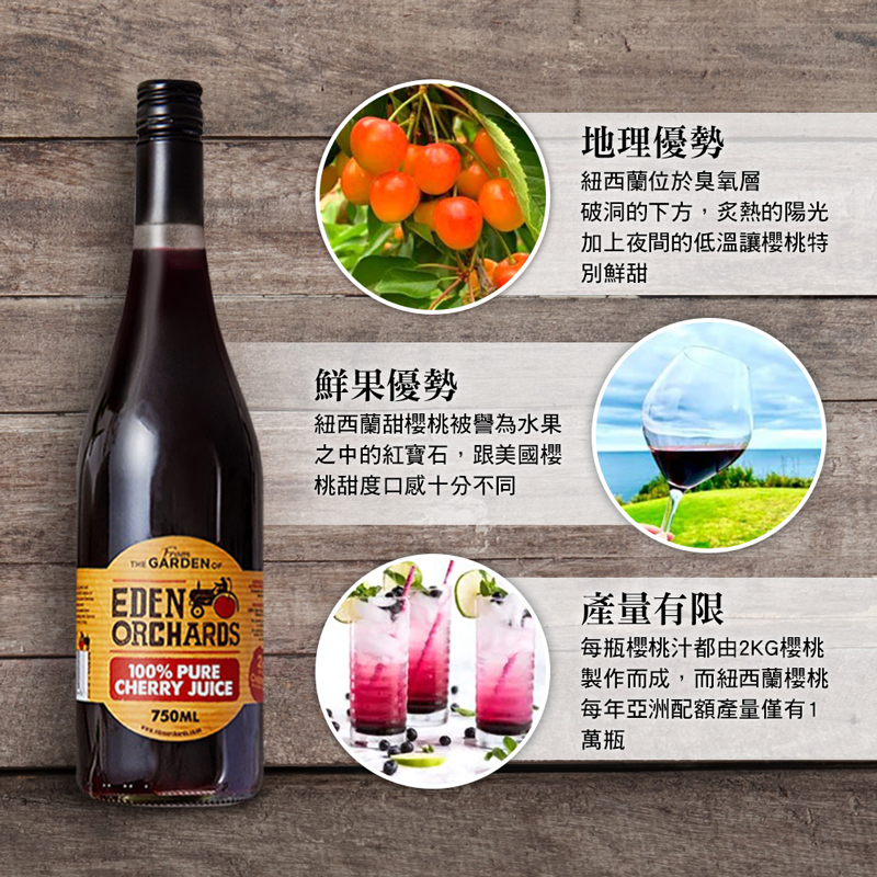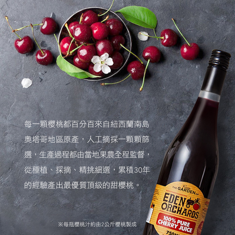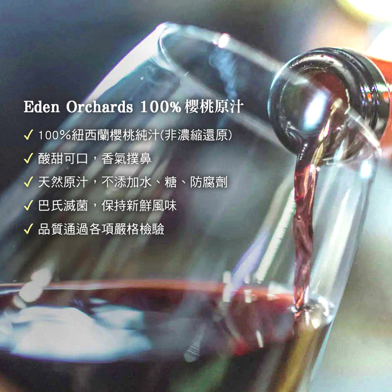 #果汁#幫助入睡#養顏美容#維生素#膳食纖維【紐西蘭Eden Orchards伊甸莊園 100%櫻桃原汁】紐西蘭櫻桃汁美味的祕密來自純淨國度紐西蘭,每一顆櫻桃都百分百來自紐西蘭南島奧塔哥地區原產,人工摘採及一顆顆篩選,外觀品質大小甜度無誤,才會過關。生產過程都由當地果農全程監督,從種植、採摘、精挑細選,累積 30 年的經驗產出最優質頂級的甜櫻桃。紐西蘭的地理位置是世界上少有,極度接近南極的寒帶國家。這使得紐西蘭南島夏季的⽩晝時間極長,⼀天當中有2分之3,超過15個⼩時的日照,陽光充沛。超長的⽇照時間加上超強度的紫外線照射,恰恰成全了紐西蘭櫻桃的⽣長需求,促使紐西蘭的甜櫻桃擁有寶⽯⼀般的暗紅⾊澤,蘊含極⾼濃度的褪⿊激素以及其他微量元素,其含量遠遠超出其他國家櫻桃的數倍之多。櫻桃的營養豐富,擁有大量的維生素C、膳食纖維、鉀、鐵、多酚、花青素及多種維生素、礦物質,有助於維持能量正常代謝,幫助維持消化道機能、健康維持、養顏美容、幫助入睡。紐西蘭Eden Orchards 100%櫻桃原汁的特色:地理優勢:紐西蘭南島的超長日照,炙熱的陽光加上夜間的低溫讓櫻桃特別鮮甜。鮮果優勢:紐西蘭甜櫻桃被譽為水果之中的紅寶石,與歐美各國的櫻桃甜度口感十分不同。限量配額:每瓶櫻桃汁都由2公斤櫻桃製作而成,而紐西蘭櫻桃每年亞洲配額產量僅有1萬瓶。• 100%紐西蘭櫻桃純汁(非濃縮還原)• 酸甜可口,香氣撲鼻• 天然原汁,不添加水、糖、防腐劑• 巴氏滅菌,保持新鮮風味• 品質通過各項嚴格檢驗商品規格: 750ml/瓶x6入成 分:100%櫻桃原汁原 產 地: 紐西蘭保存期限: 24個月有效日期: 標示於瓶身保存方式: 開瓶後需冷藏,並於1周內飲用完畢飲用方式: 每次攝取50-100毫升,可依個人喜好添加冰塊或飲用水來稀釋飲用■ 進口商名稱 : 好健康國際有限公司■ 進口商電話 : 02-26755234■ 進口商地址 : 238新北市樹林區千歲街57-7號1樓■ 投保產品責任險字號 : 1504字第11PD02948號■ 食品業者登錄字號 : H-153997270-00000-7