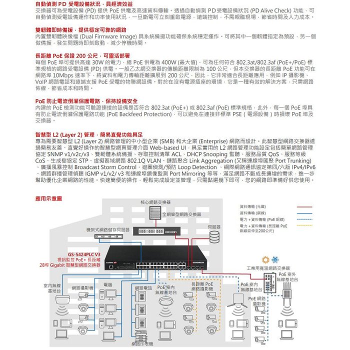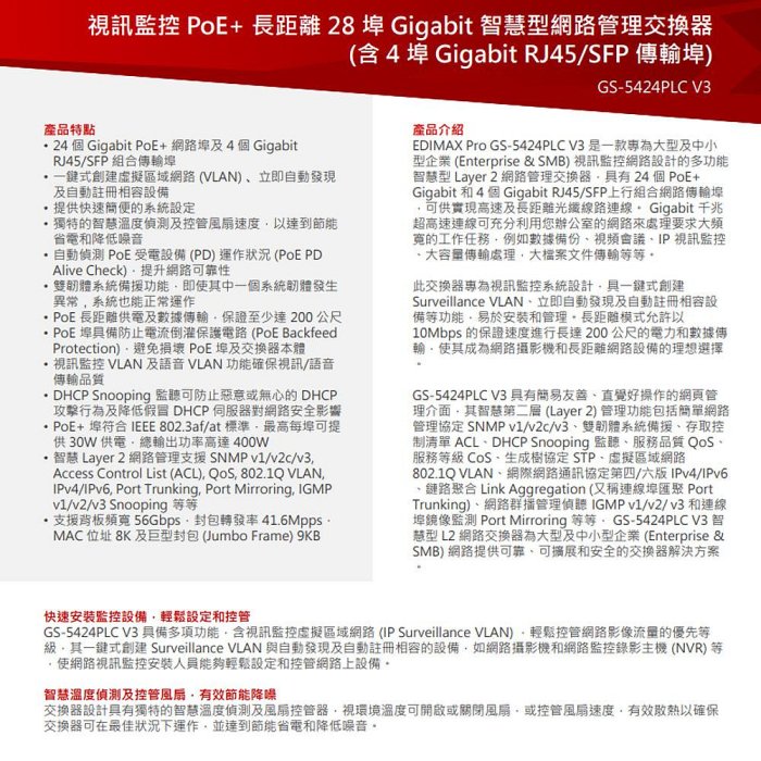 • 24 個 Gigabit PoE+ 網路埠及 4 個 GigabitRJ45/SFP 組合傳輸埠。• 一鍵式創建虛擬區域網路 (VLAN) 、立即自動發現及自動註冊相容設備。• 提供快速簡便的系統設定。• 獨特的智慧溫度偵測及控管風扇速度,以達到節能省電和降低噪音。• 自動偵測 PoE 受電設備 (PD) 運作狀況 (PoE PDAlive Check),提升網路可靠性。• 雙韌體系統備援功能,即使其中一個系統韌體發生異常,系統也能正常運作。• PoE 長距離供電及數據傳輸,保證至少達 200 公尺。• PoE 埠具備防止電流倒灌保護電路 (PoE BackfeedProtection),避免損壞 PoE 埠及交換器本體。• 視訊監控 VLAN 及語音 VLAN 功能確保視訊/語音傳輸品質。• DHCP Snooping 監聽可防止惡意或無心的 DHCP攻擊行為及降低假冒 DHCP 伺服器對網路安全影響。• PoE+ 埠符合 IEEE 802.3af/at 標準,最高每埠可提供 30W 供電,總輸出功率高達 400W。• 智慧 Layer 2 網路管理支援 SNMP v1/v2c/v3,Access Control List (ACL), QoS, 802.1Q VLAN,IPv4/IPv6, Port Trunking, Port Mirroring, IGMPv1/v2/v3 Snooping 等等。• 支援背板頻寬 56Gbps,封包轉發率 41.6Mpps,MAC 位址 8K 及巨型封包 (Jumbo Frame) 9KB。