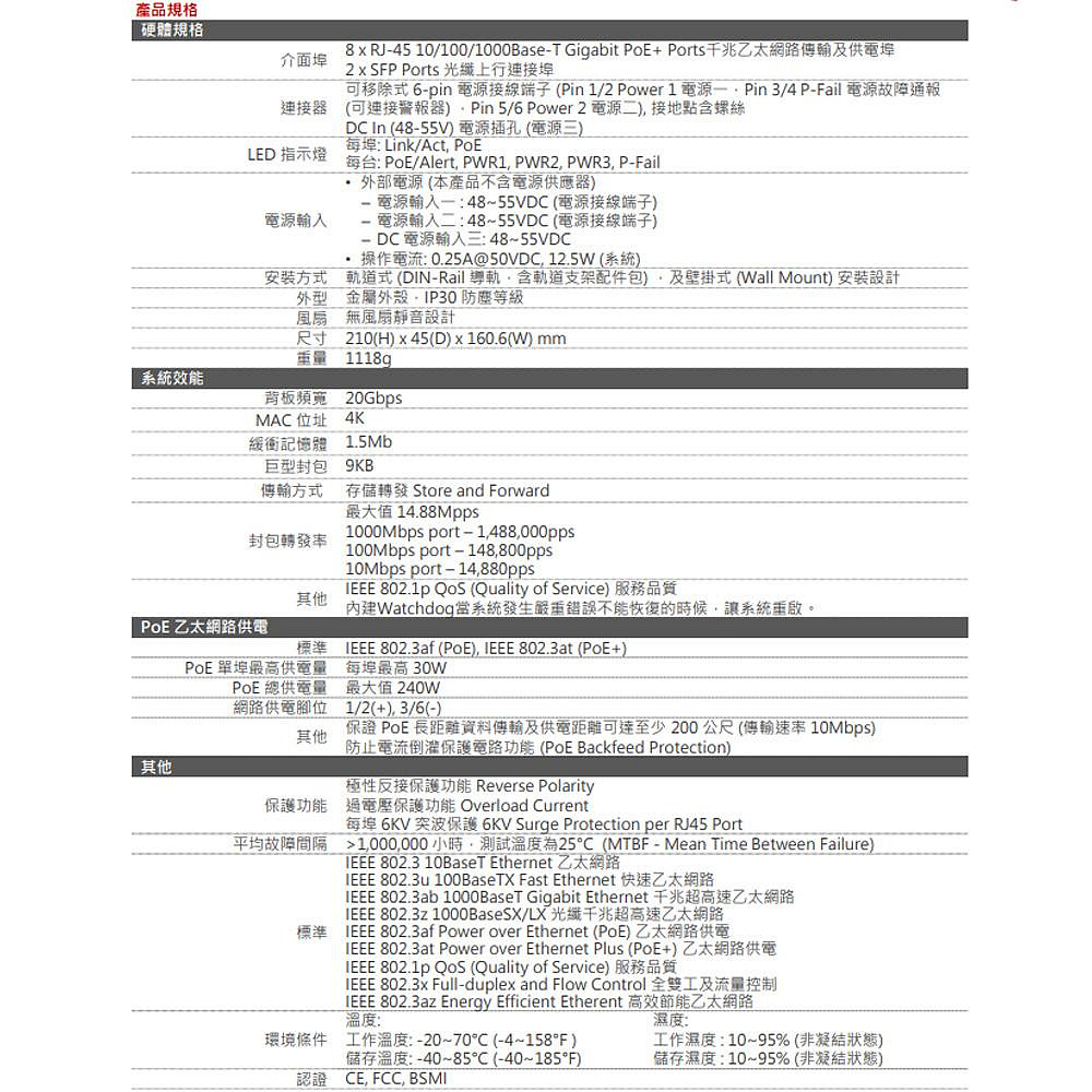 • 8 個 Gigabit PoE+ 供電的網路埠及 2 個 SFP 光纖網路連接埠。• 符合 IEEE 802.3af/at PoE 網路供電規格,總 PoE供電量最高達 240W (每埠最高 30W )。• 具備 6KV 突波保護,防雷擊以避免損壞交換器和連接的網路設備。• 高度可靠的備援電源輸入設計 (共三組電源輸入) ,確保系統保持不中斷運作。• 支援 P-Fail Relay 電源故障繼電器,可連接警報器即時發出警報,當系統偵測到機組電源異常時,保護系統將即時發出警報通知。• 長距離 PoE 資料傳輸及供電,有效距離保證可達至少 200 公尺。• 每一 PoE 埠具備防止電流倒灌保護電路,能避免PoE 及非標準 PoE 設備的電源倒灌損壞本機。• 支援 IEEE 802.1p QoS 服務品質功能,確保影像及語音流量優先處理。• 具軌道 (DIN Rail ) 及壁掛 (Wall Mount) 安裝設計。• 適用於惡劣嚴苛工業環境, 提供 -20°C 至 70°C 的寬廣操作溫度範圍、 IP30 防護等級的金屬外殼、及無風扇散熱靜音設計。