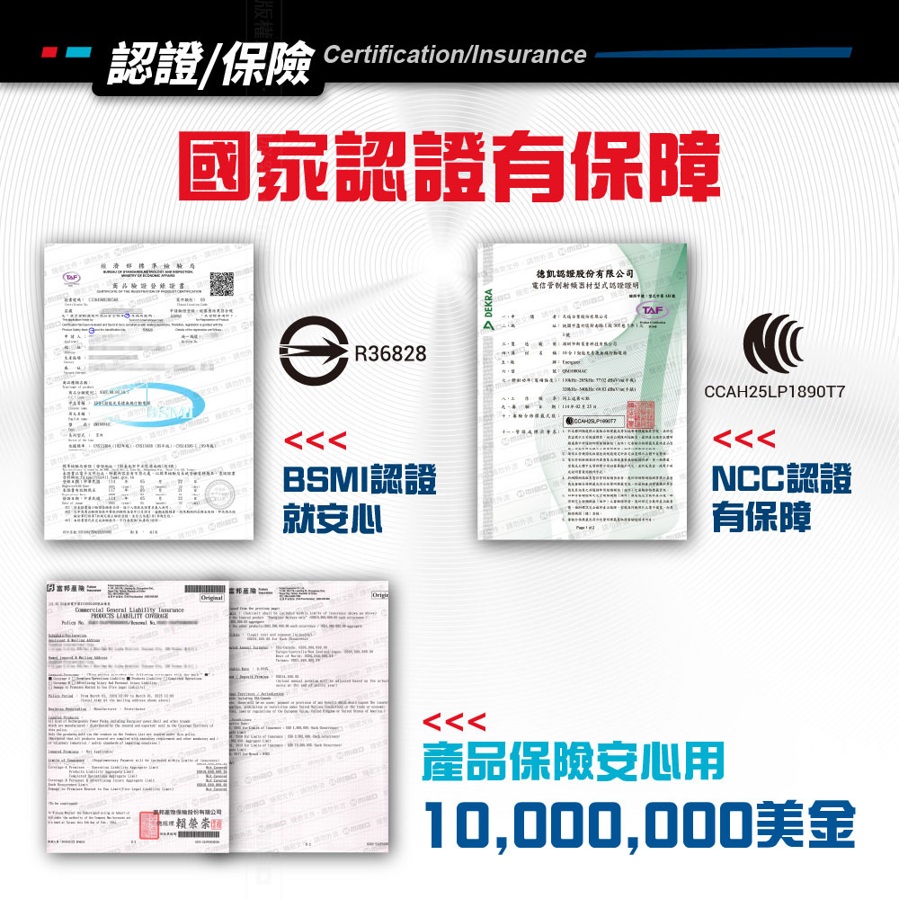 👍 BSMI、NCC國家安全雙認證,投保1000萬美元產品責任險。