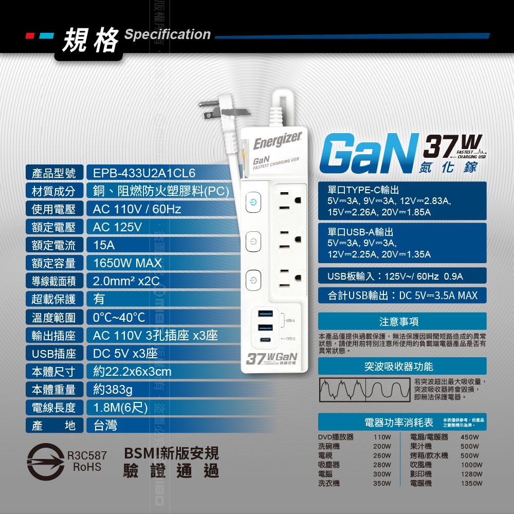 Energizer 勁量 氮化鎵Gan 37W 4開3孔3座 USB延長線 1.8米(2USB 1TYPEC 新安規 台灣製)