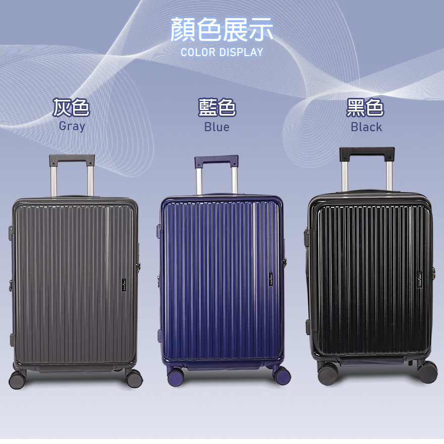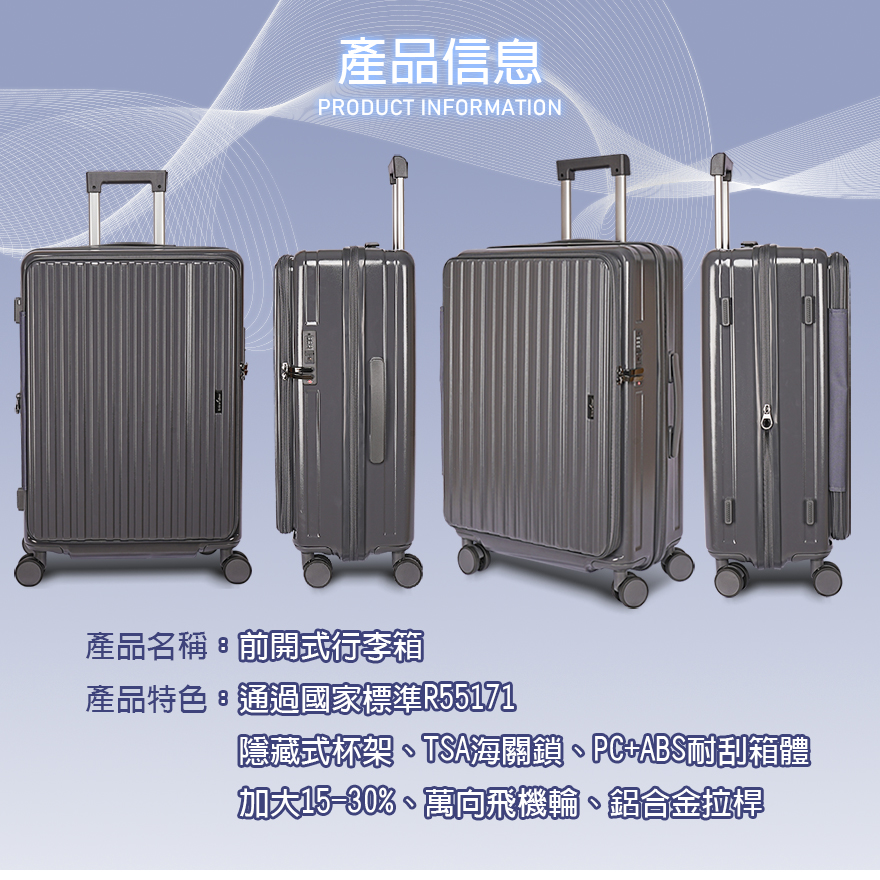 特色:隱藏式杯架、可掛式防磨腳座、PC+ABS耐刮箱體、擴充加大15-30%空間、360度靜音雙排飛機輪(55mm)、TSA國際認證密碼海關鎖、多段鋁合金拉桿、分區拉鏈網袋、X型束帶