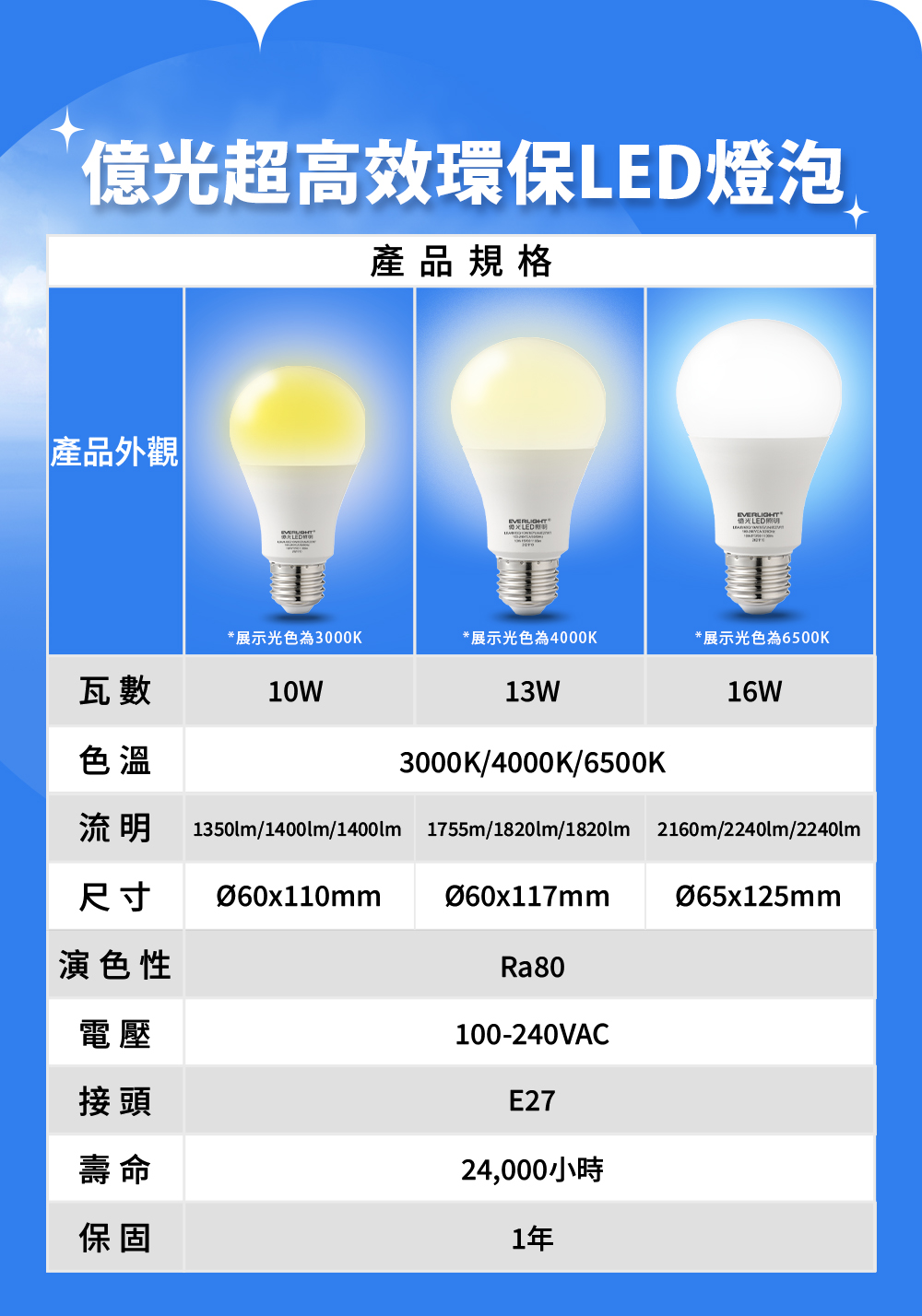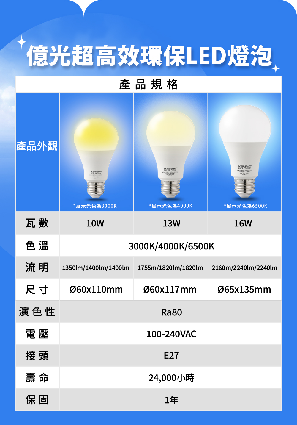 Everlight億光 6入組 16W 超高效環保LED燈泡 (白光/黃光/自然光)