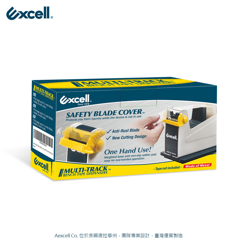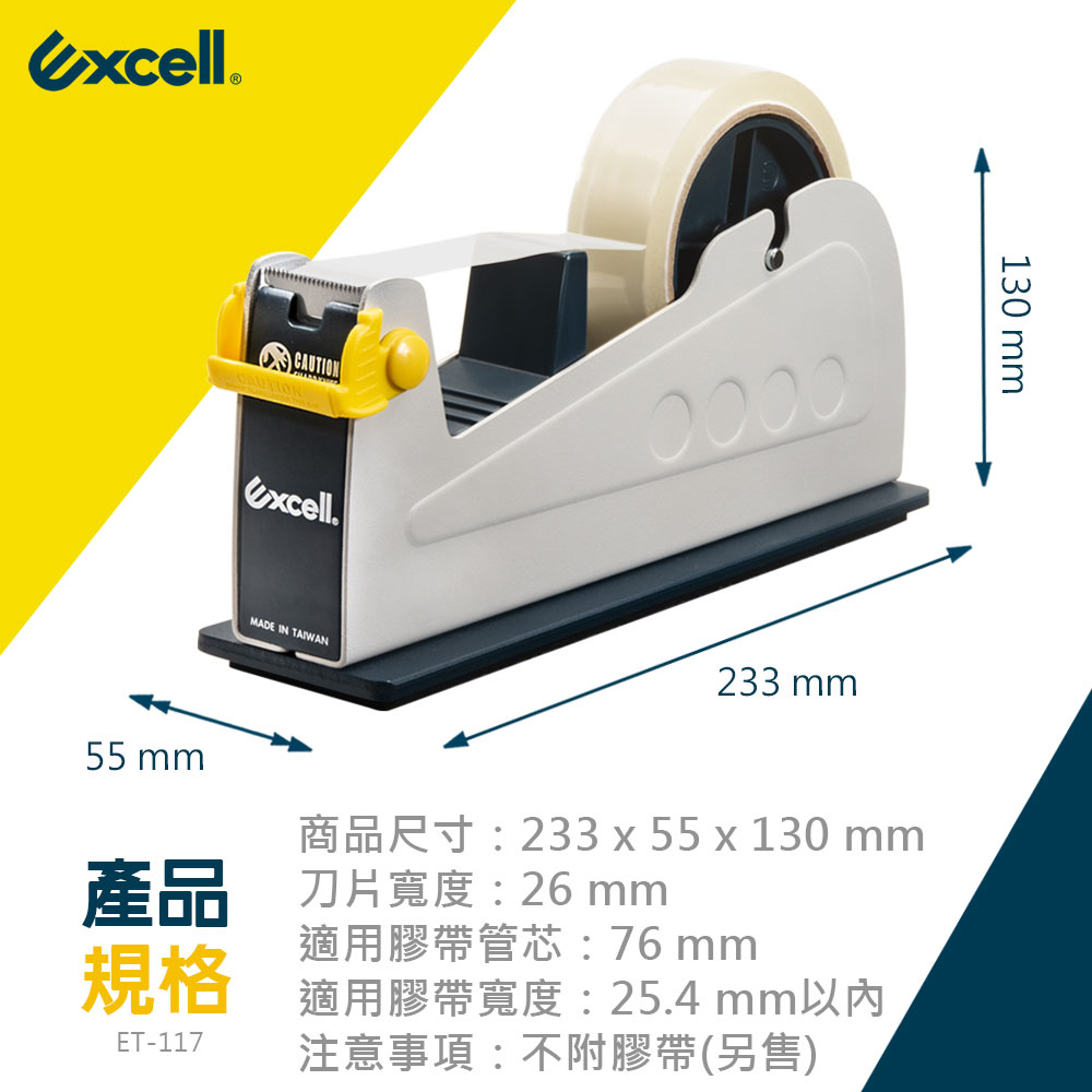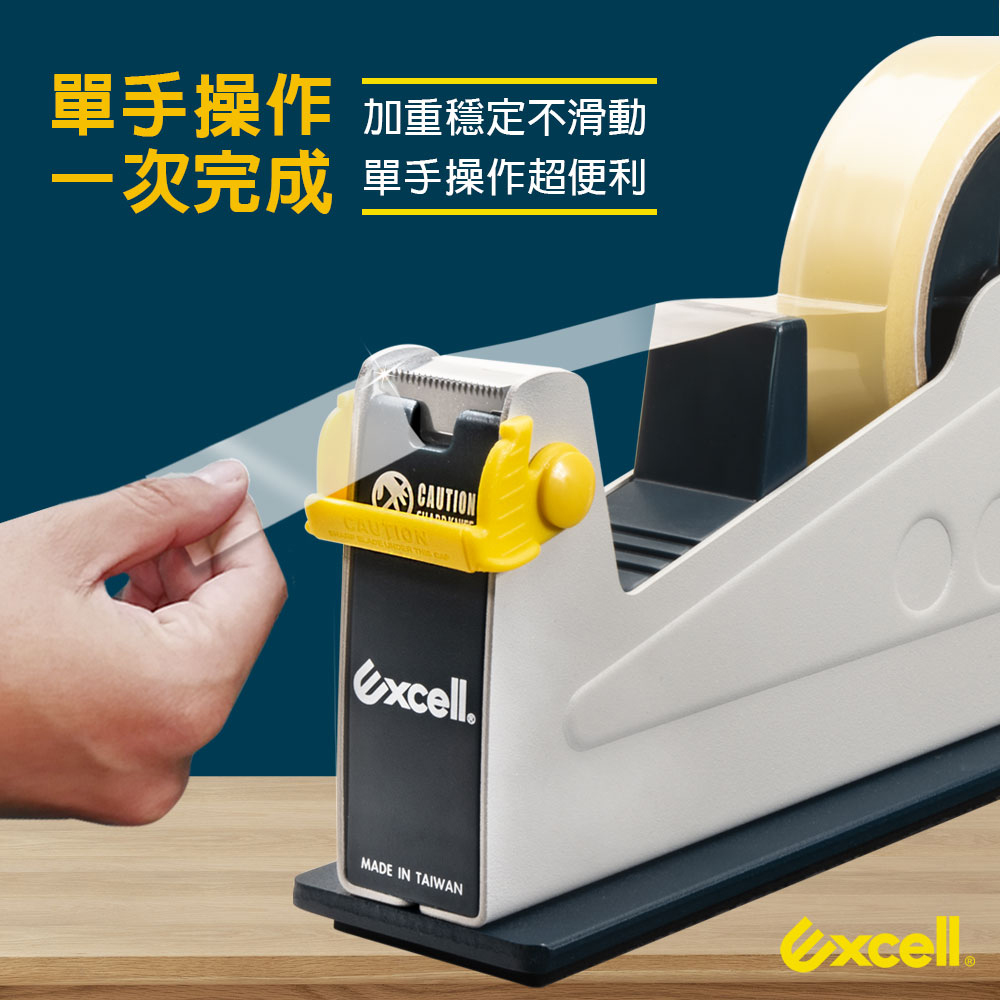 - 品牌:Excell 單軌桌上型膠帶台- 型號:ET-117- 適用膠帶:3吋管芯、寬度24.5mm以內- 商品尺寸:233 x 55 x 130 mm- 注意事項:本賣場販售單獨切台一只,不附膠帶,刀片不可替換。☆配有刀片保護蓋,安全切割不傷手☆加重穩定不滑動,單手操作超便利