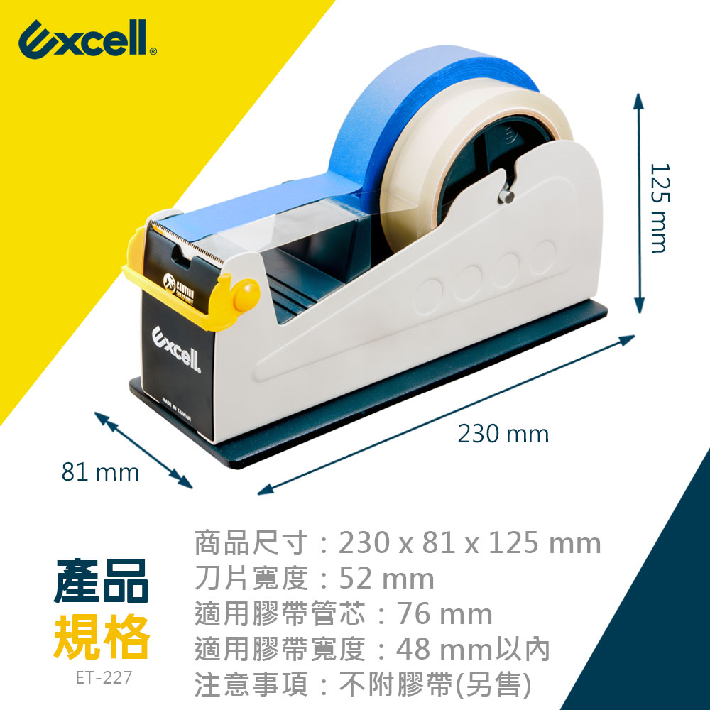 - 品牌:Excell 雙軌桌上型膠帶台- 型號:ET-227- 適用膠帶:3吋管芯、寬度48mm以內- 商品尺寸:230 x 81 x 125 mm- 注意事項:本賣場販售單獨切台一只,不附膠帶,刀片不可替換。☆配有刀片保護蓋,安全切割不傷手☆加重穩定不滑動,單手操作超便利☆特殊雙軌設計,可放3吋管芯膠帶48mm*1捲,或24mm*2捲