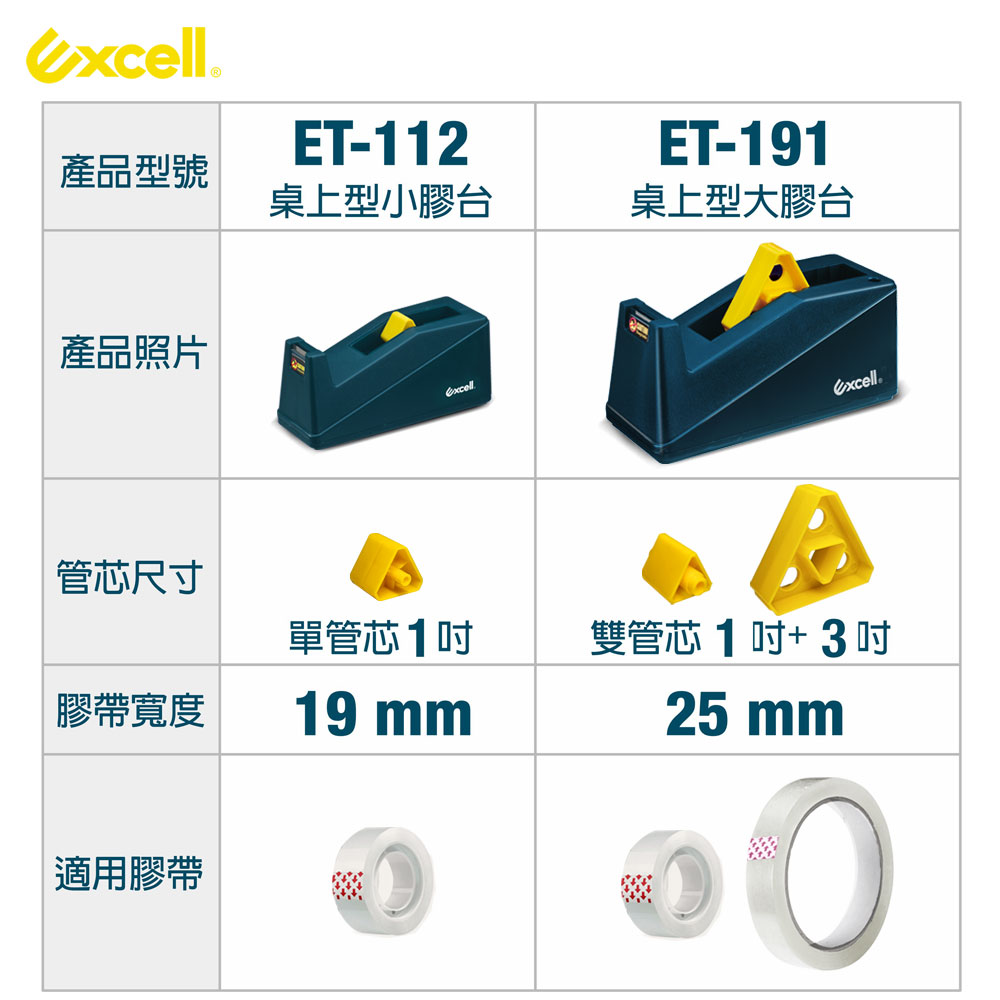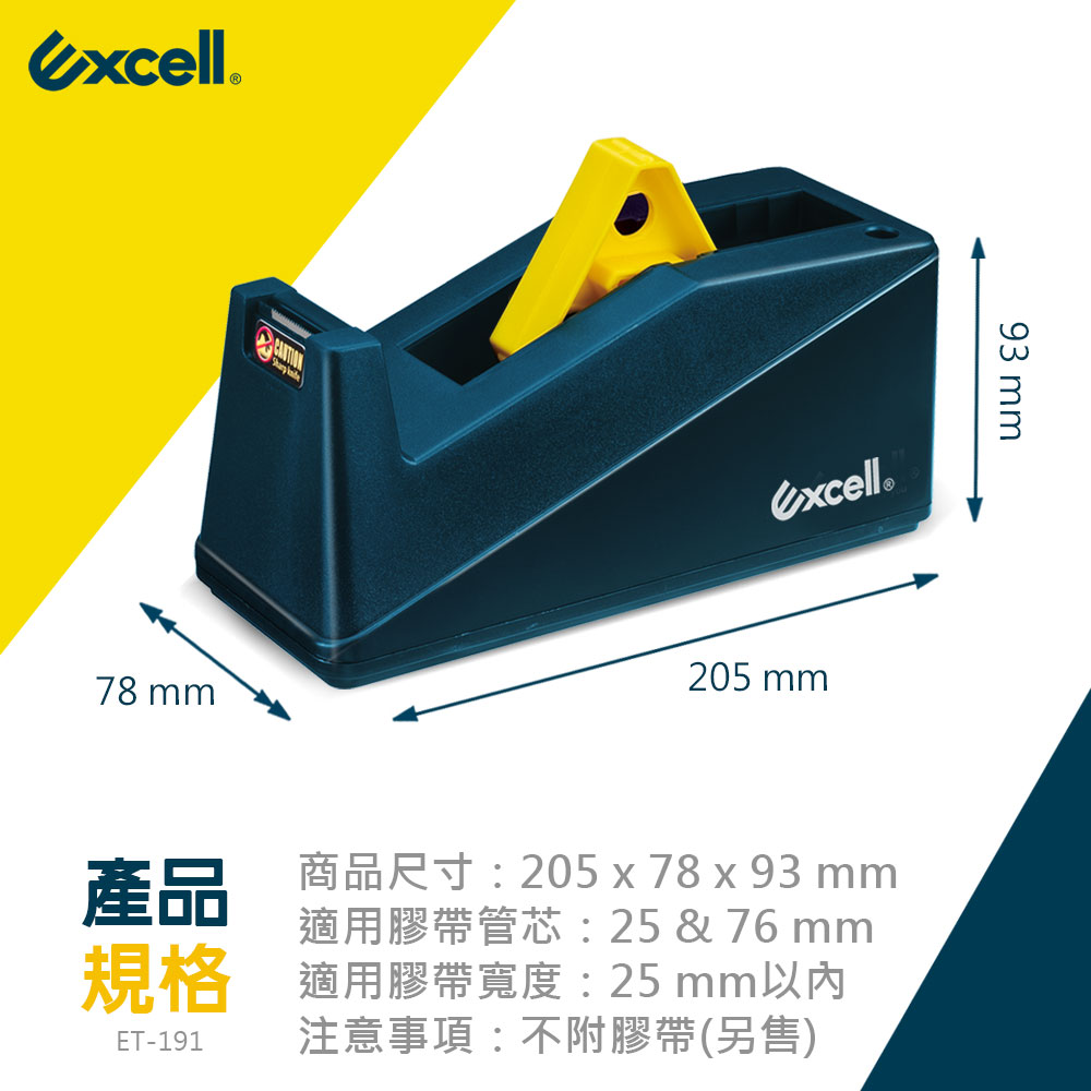 - 品牌:Excell 桌上型大膠台- 型號:ET-191- 適用膠帶:1吋及3吋雙管芯設計、寬度25mm以內- 商品尺寸:205 x 78 x 93 mm- 注意事項:本賣場販售單獨切台一只,不附膠帶,刀片不可替換。
