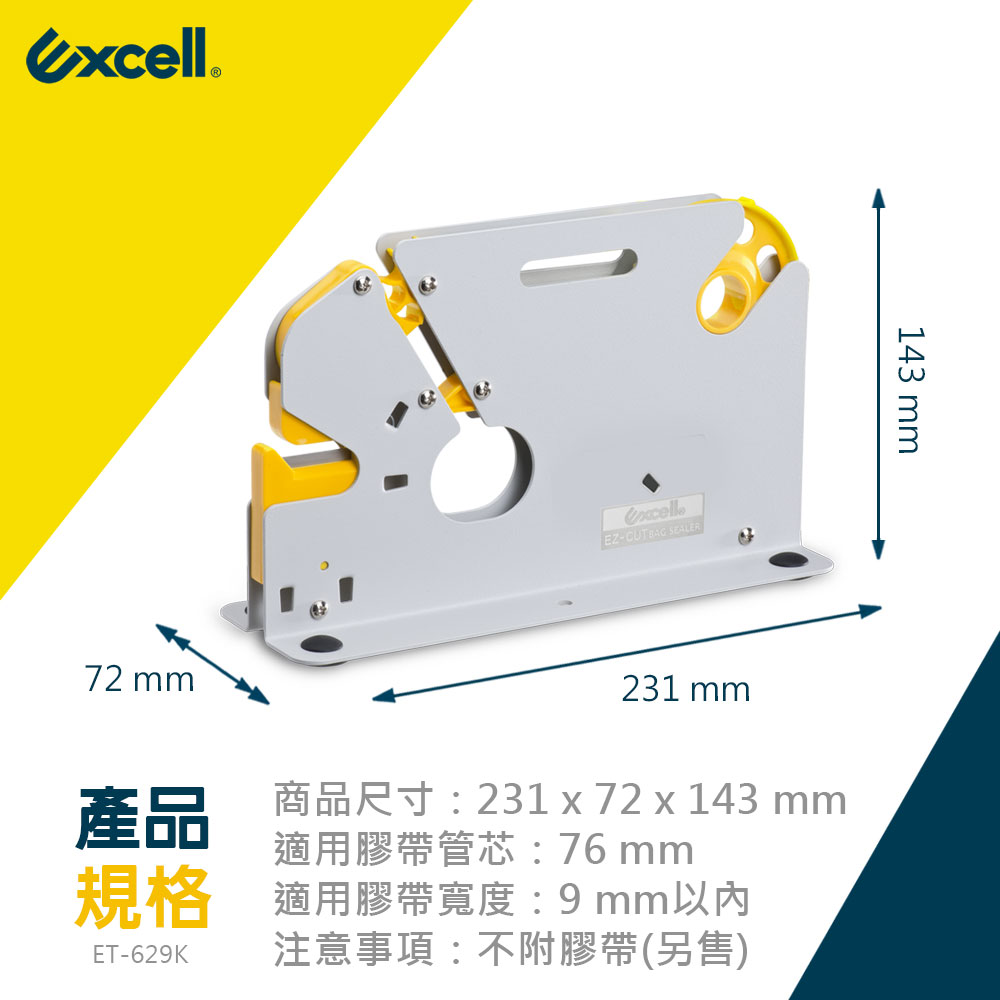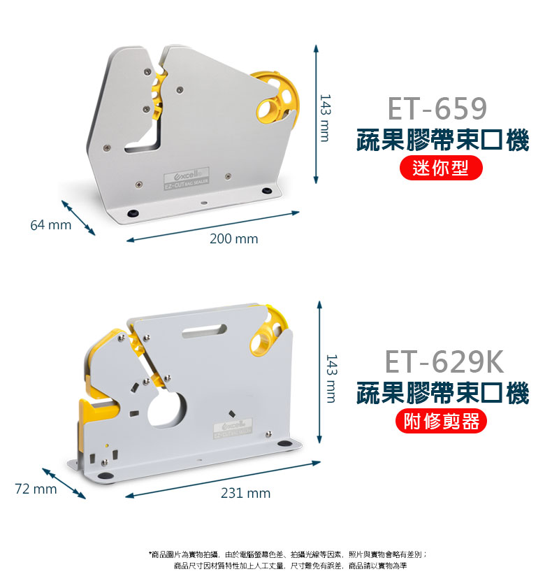 - 品牌:Excell 蔬果膠帶束口機- 型號:ET-629K- 適用膠帶:3吋管芯、寬度9mm以內- 商品尺寸:231 x 72 x 143 mm- 注意事項:本賣場販售單獨切台一只,不附膠帶,刀片不可替換。