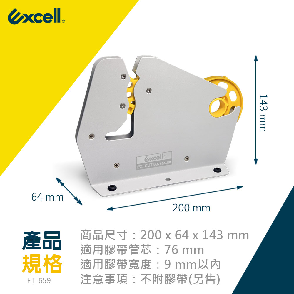 - 品牌:Excell 蔬果膠帶束口機(迷你型)- 型號:ET-659- 適用膠帶:3吋管芯、寬度9mm以內- 商品尺寸:200 x 64 x 143 mm- 注意事項:刀片不可替換。
