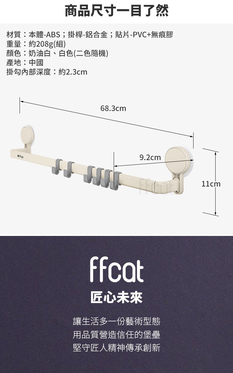 商品規格:1.品牌: ffcat2.內容: 單桿長毛巾架 x 1、移動掛勾 x 6、強力無痕貼 x 23.材質: 本體-鋁合金;掛鉤-ABS;背膠-PVC+無痕膠4.尺寸: 約寬68.3*深9.2*高11cm5.重量: 約228g/組6.顏色: 奶油白、白色(二色隨機)7.產地: 中國※商品為人工丈量略有誤差,請以實品為準。※網頁圖片因拍攝關係或螢幕設定不同而會與實際商品略有色差,請以實際收到商品為準。