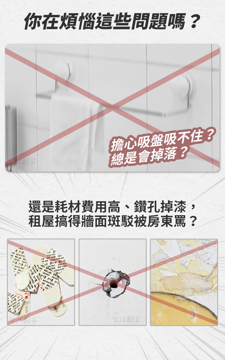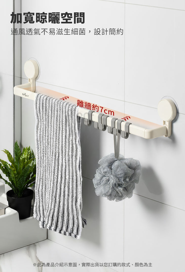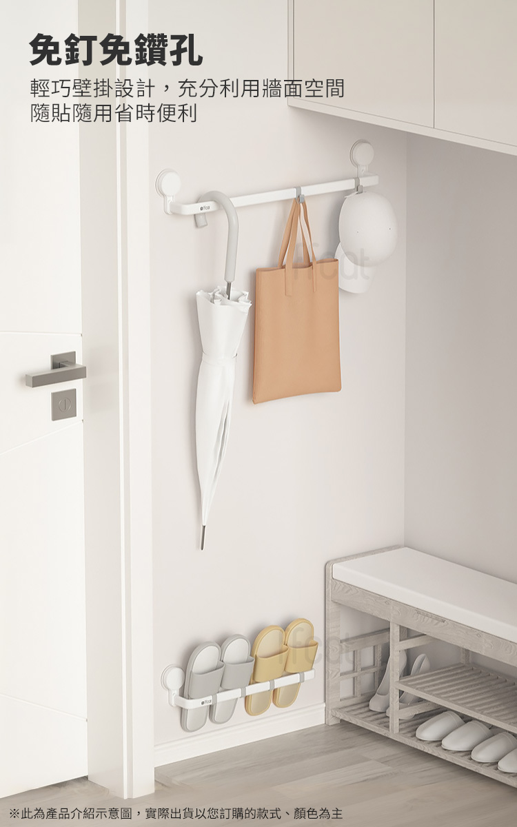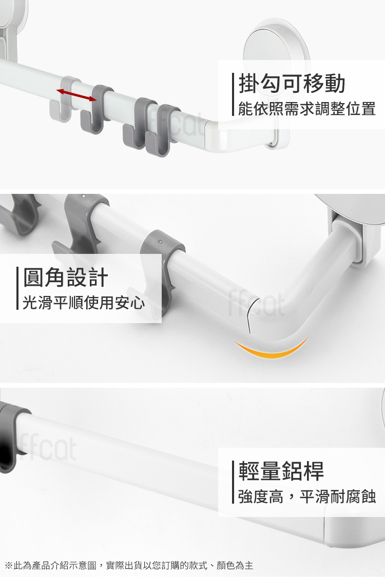 ffcat 免打孔強力無痕貼單桿長毛巾架|浴室廚房牆面收納解決方案毛巾曬不乾?抹布總是亂掛?吸盤常掉、鑽孔怕留痕?這款【ffcat 免打孔強力無痕貼單桿長毛巾架】專為「不想破壞牆面、卻需要穩固收納」的人設計。不用鑽孔、不用鎖螺絲,貼上即可使用,特別適合租屋族與重視牆面美觀的家庭。✨✅ 免釘免鑽,一貼即用:適用於光滑平整的磁磚、玻璃、不鏽鋼表面,避免牆面破壞。✅ 離牆約7cm空間:加深通風距離,毛巾、浴巾不貼牆,減少壁面潮濕感。✅ 活動式掛鉤設計:掛勾可左右滑動,自由調整間距,毛巾、沐浴球、抹布都能分類吊掛。✅ 嚴選輕量化鋁材:採用鋁合金材質,不僅防潮、不生鏽,更具備高強度支撐力,輕盈卻無比堅固。✅ 強大承重力:經實測可穩定承重 6kg,無論是厚重浴巾還是瓶裝備品都能安心懸掛。✅ 極致空間利用:修長設計,專為廚房、浴室甚至洗衣機旁的窄縫空間優化,不佔坪數卻能創造倍增空間。🌈 使用後你會發現…🛁 浴室不再凌亂🍽 廚房抹布有固定位置🧺 洗衣機側邊也能利用🚪 窄縫空間也能安裝當收納不再需要鑽牆,生活的彈性就回來了。搬家可拆卸、不留明顯痕跡,牆面保持完整,美觀與實用兼顧。👉 現在就升級您的居家空間!別讓凌亂影響了您的心情。生活采家 ffcat 免打孔掛鉤桿 提供最簡單、最無損的收納升級方案。無論是租屋自住還是舊屋翻新,這都是最聰明的投資。#生活采家 #免打孔收納 #廚房美學 #浴室改造 #租屋必備📣 FAQ(常見問答)Q1:這款毛巾架真的不用鑽孔嗎?A1:是的,採用無痕貼片設計,免釘免鑽即可安裝於光滑硬質表面。Q2:可以安裝在哪些牆面?A2:適用光滑磁磚、玻璃、不鏽鋼等光滑平整表面,不建議安裝於壁紙、粗糙水泥或粉刷牆。Q3:掛勾可以調整位置嗎?A3:可以,掛勾可左右滑動,自由調整間距。Q4:拆除會留殘膠嗎?A4:使用吹風機對準背膠加熱軟化,即可輕鬆撕除不留痕跡。Q5:可以掛重物嗎?A5:承重測試6KG,日常毛巾與小物使用無虞,請勿長期超重使用。Q6:安裝後多久可以開始掛東西?A5:建議安裝完畢並排擠出背膠空氣後,靜置 24 小時讓黏性達到最佳狀態再掛物。注意事項:1.安裝前請確保牆面乾燥、無油汙、無灰塵,以確保背膠效能。2.避開接縫, 黏貼時應避開瓷磚間的接縫處,確保背膠完全貼合。3.承重限制, 建議安全承重範圍在 6kg 以內,請勿懸掛貴重、易碎或超重物品。4.環境溫度, 建議在 5°C 至 45°C 的環境下使用,避免陽光長期直射。5.氣泡排除, 黏貼背膠時請由內向外用力按壓,務必將空氣完全排出。
