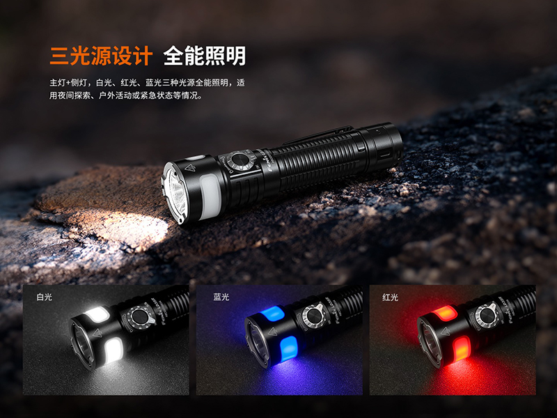 ◎白光/紅光/藍光三光源設計,滿足不同場景的照明需求