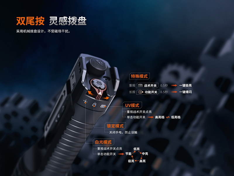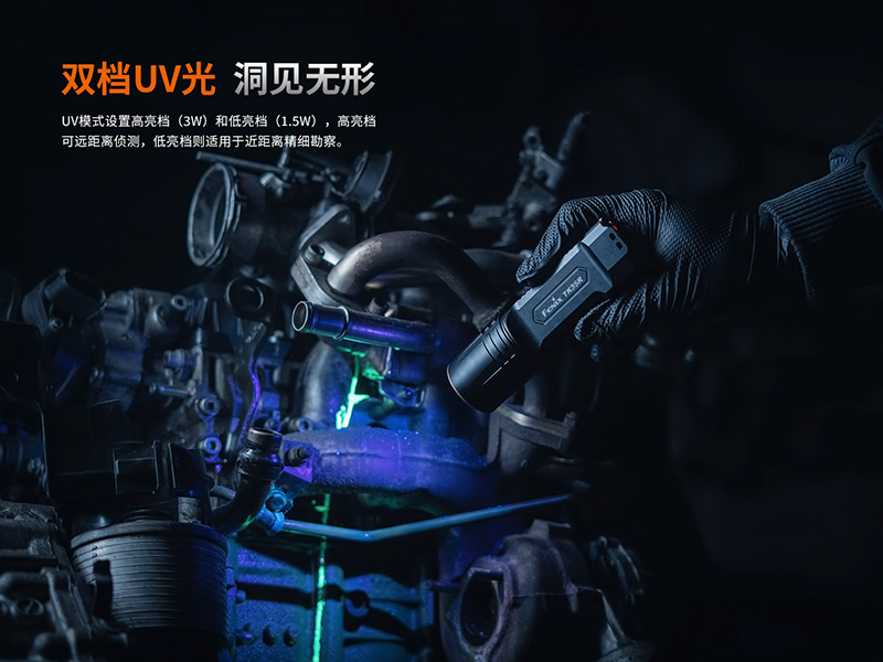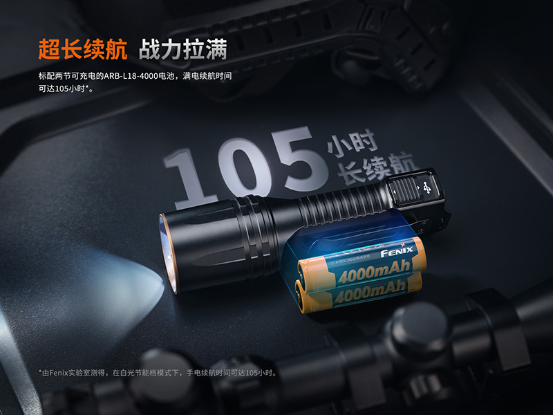 ◎採用4顆Luminus SFT25R以及1顆Luminus SST08 UV燈珠;◎搭載高精度紫外光源,中心波長為365 nm,可用於檢驗證件、防虛擬碼等◎最高亮度5800流明,最遠射程610米;◎尾部採用靜音戰術雙開關,具備一鍵爆閃、一鍵極亮功能;◎靈感撥盤設計允許無縫切換多種模式,包括白光模式、鎖定模式及UV模式◎高強度鋁合金外殼;◎標配2節可充電的Fenix ARB-L18-4000 鋰離子電池;◎機身尾部帶有USB-C充電介面,且設有充電滑蓋;◎筒尾電量指示功能,顯示即時電量;◎智慧溫控功能及低壓警示功能;◎尺寸(±10%):154.0mm(筒長)*43.0mm(筒頭);◎重量(±10%):342克(含電池)