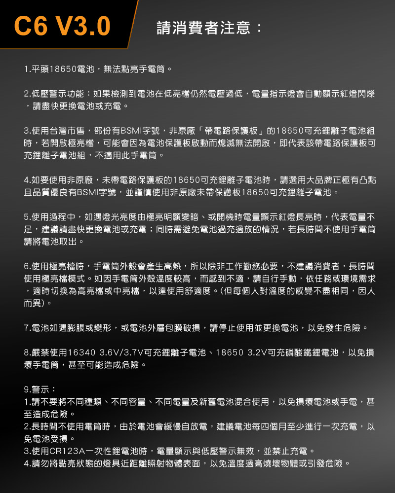 (以下為原廠提供參考數據,非絕對)品名:FENIX C6 V3.0 高性能直充作業手電筒型號:#C6 V3.0 橘色、#C6 V3.0 藍色