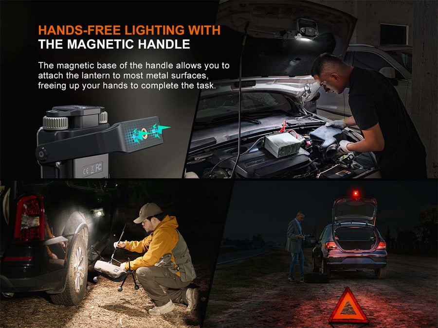 ◎聚泛組合最高亮度1600流明,最遠射程180米◎使用一顆三色COB+一顆Luminus SST20優質光源,壽命50000小時◎採用聚、泛雙光斑光學設計,兼顧遠射與近距離照明◎紅白雙光源,滿足不同場景的照明需求◎標配1節5000mAh大容量電池◎雙旋鈕設計,自訂調節光源亮度和色溫◎360度旋轉把手,可自由調節角度確保全方位照明◎把手具有磁吸功能,可直接吸附在鐵質物體表面◎USB Type-C充電介面,有充電指示和低壓警示功能◎把手底部設計有三腳架螺紋介面,可有效固定和控制光源的高度◎採用優質鋁合金前殼,堅固可靠◎尺寸(±10%):109.8(長)x 39.6(寬)× 91.7(高)毫米◎重量(±10%):300克(含電池)