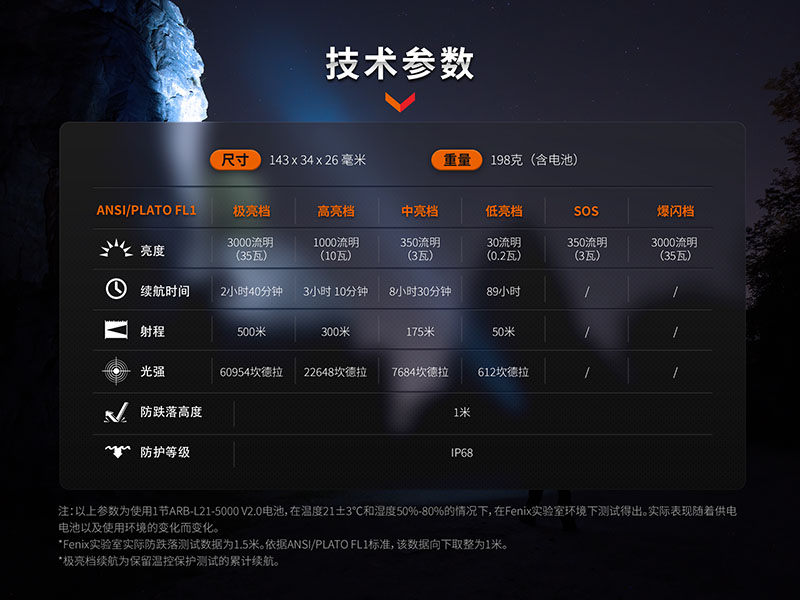 ※本產品說明,僅供參考,請勿作為正式採購招標規格,如有需要,請來電本公司洽詢相關業務人員。 (以下為原廠提供參考數據,非絕對) 品名:FENIX PD40R V3.0超高亮機械旋轉調光手電筒 型號:#PD40R V3.0 ◎最高亮度3000流明,最遠射程500米 ◎使用1顆高性能LED,壽命50000小時 ◎標配1節ARB-L21-5000 V2.0電池 ◎專利頸部機械旋轉調光技術,檔位精准,可單手操作,不易誤觸 ◎Type-C充電介面,充電速度快,通用性強 ◎開機電量顯示和低壓警示功能 ◎尾部平整,可倒立使用 ◎配備抱夾,適應多種場景需求 ◎全金屬CNC加工機身 ◎表面進行了HAIII硬質陽極氧化抗磨處理 ◎尺寸(±10%):143x 34x 26毫米 ◎重量(±10%):198克(含電池)