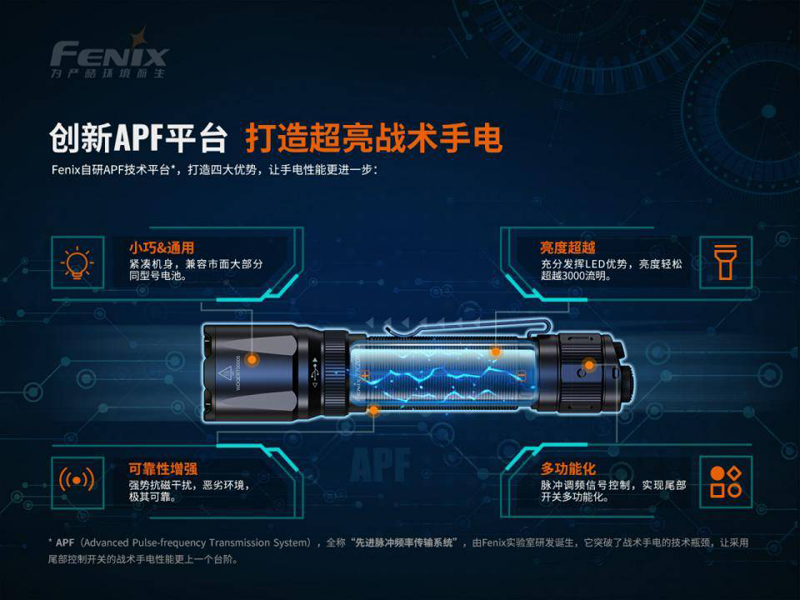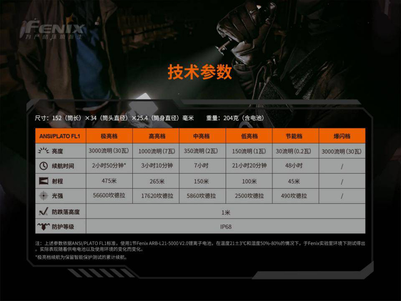 ◎最高亮度3000流明,最遠射程475米◎使用1顆Luminus SFT70 LED,壽命50000小時◎標配1節Fenix ARB-L21-5000 V2.0鋰離子電池◎採用APF先進脈衝頻率傳輸系統,盡顯戰術優勢◎戰術雙尾按控制,快速實現一觸即亮和一鍵爆閃◎機身隱藏式Type-C介面,充電快速◎內部雙彈簧結構,劇烈衝擊下依舊穩定照明◎採用A6061-T6鋁合金材質製造◎表面進行了HAIII硬質陽極氧化抗磨處理◎尺寸(±10%):152(筒長)×34(筒頭直徑)×25.4(筒身直徑)毫米◎重量(±10%):204克(含電池)