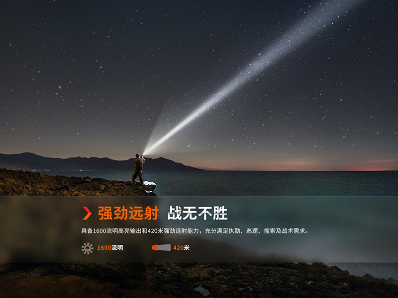 ◎最高亮度1600流明,最遠射程420米◎使用1顆Luminus SFT40 LED,壽命50000小時◎使用1節18650可充電鋰離子電池供電◎機身帶USB-Type C充電介面,內防水結構◎可單手尾部開關,一鍵爆閃◎採用T6061-T6鋁材製造,表面進行了HAIII硬質陽極氧化抗磨處理◎尺寸(±10%):145.5(筒長)×34(筒頭)×23.5(筒身)毫米◎重量(±10%):117.5克(不含電池)