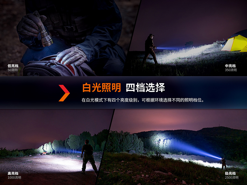 ◎最高亮度2500流明,最遠射程640米◎使用1顆Luminus SFT70 LED,壽命50000小時◎使用1顆Luminus SFT20 RA高性能紅光LED,能發出400流明紅光,最遠射程120米◎使用1顆Luminus SFT20 CG高性能綠光LED,能發出1400流明綠光,最遠射程210米◎專利設計的3光源TIR透鏡,透鏡直徑減少30%,射程翻倍◎使用1節Fenix ARB-L21系列可充電鋰離子電池供電◎可單手操作尾部雙開關,一鍵爆閃◎採用T6061-T6鋁材製造,表面進行了HAIII硬質陽極氧化抗磨處理◎尺寸(±10%):160(筒長)×52(筒頭)×25.4(筒身)毫米◎重量(±10%):185克(不含電池)