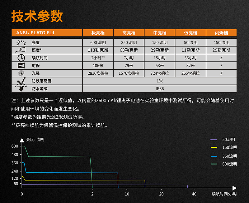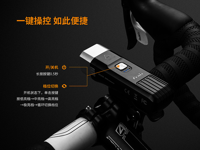 (以下為原廠提供參考數據,非絕對)品名:FENIX BC25R 輕量化自行車燈型號:#BC25R◎截止線光斑,防眩目,城市騎行更安全◎使用Cree XP-G3中白光,最高亮度600流明◎內置2600mAh鋰離子電池◎採用Micro USB 充電◎±10%:113毫米 (長) x 32毫米(寬) x31毫米(高)◎±10%:淨重155克(包含支架+電池)◎電量指示和低電警示功能◎一鍵操控◎支架快拆,方便使用◎可手持使用◎全金屬散熱稽,性能可靠