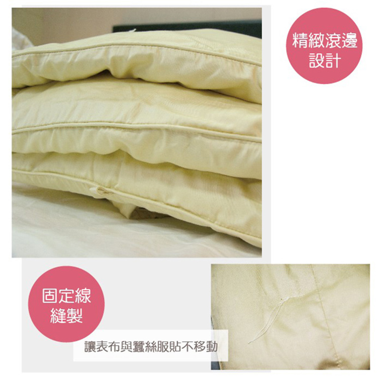 ◎蠶絲被特性1.吸濕保暖性佳 : 蠶絲為動物蛋白質纖維,冬季可預防濕寒氣透入,能迅速吸收並散發人體汗氣,強韌而保暖2.強韌性 : 蠶絲纖維極長而強韌,因此經久耐用,決不斷絲3.質地輕柔,防蹣抗菌 : 觸感柔順細緻,不結塊,透氣不悶熱,服貼較不引起過敏,患有呼吸疾病或過敏體質者尤其適用