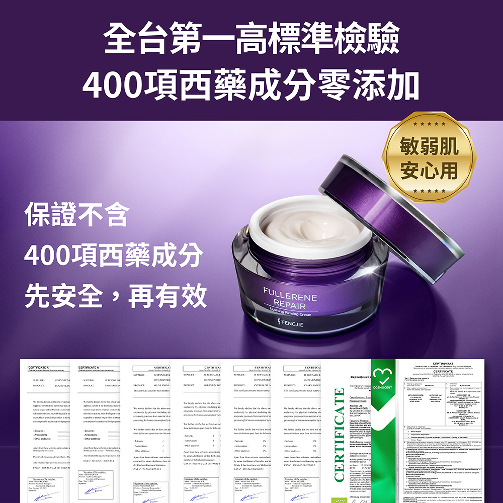 2種富勒烯介紹說明:我們使用的是Lipo Fullerene,透過脂質體包覆技術的脂溶性富勒烯,Radical Sponge 則是水溶性,兩者無優劣之分,有獲得此標章,都含有1%以上的富勒烯添加量,只是因為劑型不同,而使用不同的富勒烯。