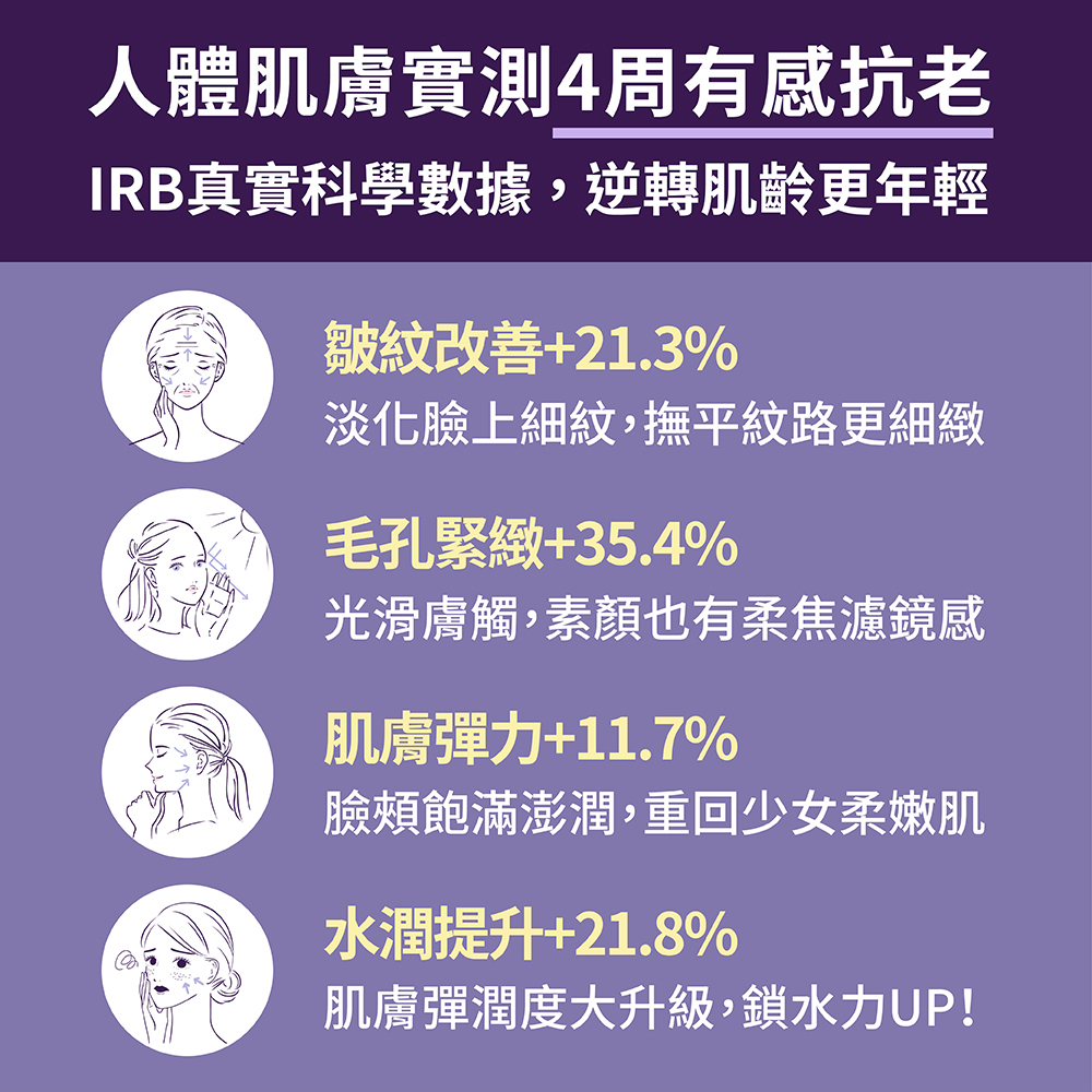 ➤IRB人體肌膚試驗,4周明顯改善老化膚況