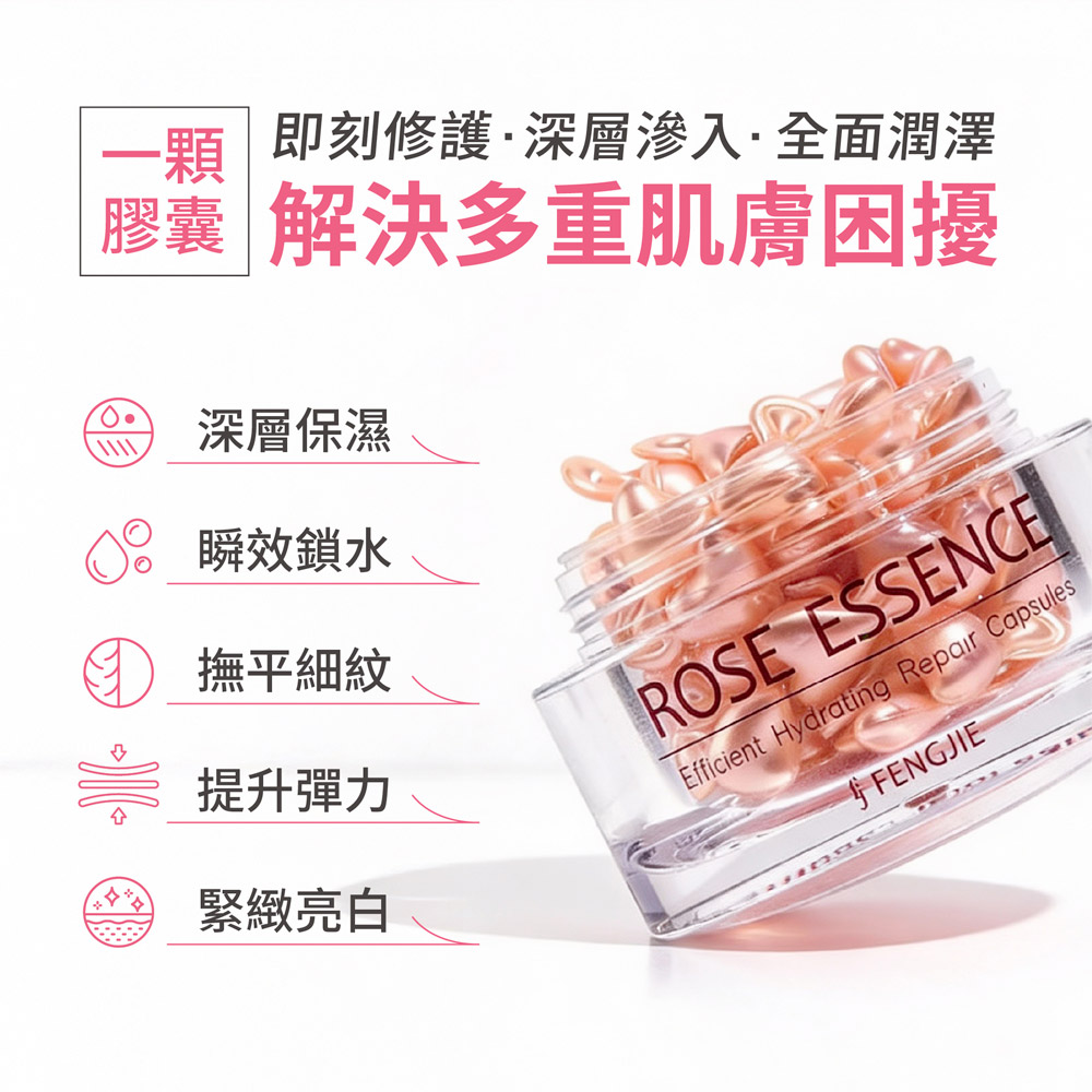 Q1.什麼樣的肌膚不適用呢?本產品適用於所有膚質,但有開放性傷口的肌膚不建議,請好好讓傷口復原後再使用喔!Q2.孕婦與男性也適用嗎?當然適用!孕婦可安心使用,且豐傑的產品主要以全膚質適用研發生產,不論男女皆可使用喔。Q3.可以搭配粉底液使用嗎?可以喔,化妝時將玫瑰活膚膠囊轉開,加入1~2滴至粉底液當中,稍微混合之後,上妝可增加妝感服貼度,打造光澤感肌膚。Q4.有敏感情形但真的很想使用怎麼辦?建議您可先聽從醫師建議,確認敏感源後再做使用。Q5.修修臉之後可以使用嗎?可以的,修修臉後反而更需要注重臉部保濕,若您有進行開放性肌膚療程,還是建議先諮詢過醫師。Q6.玫瑰瞬效活膚膠囊包含哪些主成分?包含六大美膚精粹:黃金海藻、英國玫瑰果、摩洛哥堅果、酪梨果油、植物角鯊烷、維他命E,以及鎖水關鍵神經醯胺等,多方精華成分濃縮而成。Q7.想要讓緊緻嫩膚效果更好該怎麼做?想要讓緊緻嫩膚效果更好,化妝水、精華液不可少!好的化妝水可以幫助增加後續護膚品吸收率,精華液則是可以精準高效保濕撫紋。如果您容易乾燥且有細紋問題,推薦您搭配使用【玫瑰潤澤青春露】和【玫瑰賦活精華液】,潤澤淡紋效果更加乘呦!Q8.「逆齡霜」跟「玫瑰膠囊」,那個先用?先擦霜還是先擦油?保養過程建議先水後油;將玫瑰膠囊放在最後一道程序使用。例如:玫瑰青春露→極萃煥白雪肌露→富勒烯逆齡霜→玫瑰活膚膠囊,更能夠幫您加強潤澤鎖水的效果---------------------------------------------------------------------------【使用方式】適合臉部清潔後或精華液後使用。輕輕扭開膠囊將精華擠於掌心,由較乾、暗沉部位開始向外按摩推勻。【產品功效】保濕.緊緻.嫩白,1顆極致滋養、重返青春對抗肌膚老化、快速滲透,延緩老化滋養皮膚、輕柔按壓,釋放最新鮮的逆齡能量 【商品特色】✔輕柔按壓,釋放最新鮮的逆齡能量 ✔六大美膚精粹,脂溶性更有效穿透 ✔法國深海巨藻,啟動青春能量 ✔王妃最愛逆齡秘密,活化緊緻肌膚 ✔快速滲透滋養、延緩老化改善皮膚彈性 ✔重返青春對抗肌膚老化,強化屏障功能 【主要成分】 CyclopentasiloxaneㆍDimethiconol、Isotridecyl IsononanoateㆍSqualane ㆍ Helianthus Annuus (Sunflower) Seed Oil Unsa-ponifables ㆍ RoseHip Seed Oil 、 Caprylic/Capric Triglyceride Simmondsia Chinensis (Jojoba) Seed Oil 、Tocopheryl Ace-tate ㆍ Persea Gratissima (Avocado) Oil ㆍ Pelargonium Grave-olens Flower Oil ㆍCupressus Funebris Wood Oil ㆍ Bisabolol 、Argania Spinosa Kernel Oil、Beheny AlcoolLaminaria Ochroleuca Extract ㆍ Polyglyceryl-10 Pentastearateㆍ Sodium Stearoy| Lactylate、Phytosteryl Isostearate、Ceramide 3 Ceramide 6 || Ceramide 2.【商品規格】容量規格: 3顆/袋保存期限: 3年貨源: 公司貨產地: MIT劑型:液劑【注意事項】皮膚有傷口、紅腫、過敏、濕疹等異常狀,請先詢皮膚專科醫生意見後再斟酌使用。使用中若肌膚出現刺痛、搔療狀況,或不慎碰到眼睛時,請迅速用清水清洗。使用後若有過敏不適現象,應立即停止使用並詢問皮膚專科醫師。本產品不可食用,請放置孩童無法取得之處。